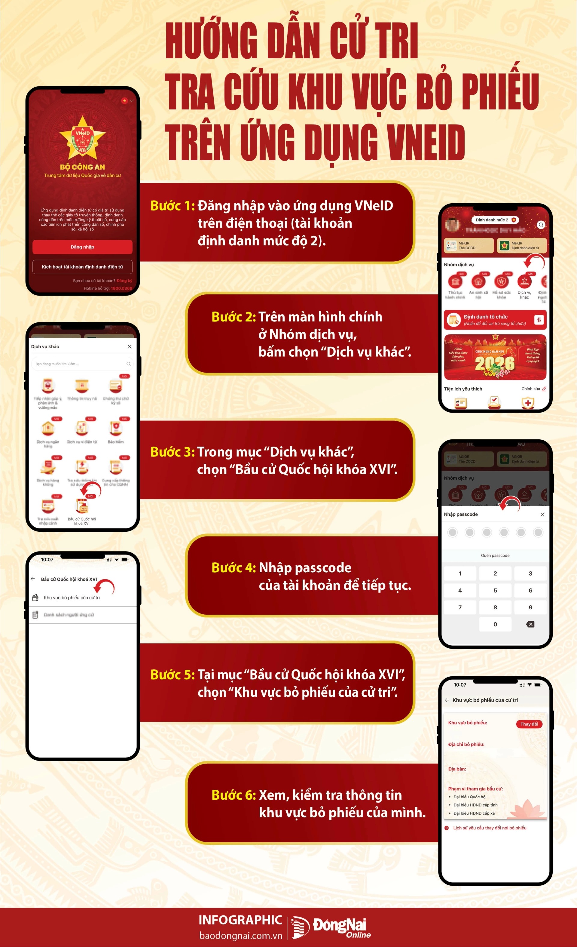 (ĐN) - Nhằm tạo điều kiện thuận lợi cho công dân trong việc tra cứu thông tin bầu cử, góp phần bảo đảm quyền và nghĩa vụ của cử tri trong cuộc bầu cử đại biểu Quốc hội khóa XVI và đại biểu HĐND các cấp nhiệm kỳ 2026-2031, Bộ Công an đã tích hợp chức năng tra cứu địa điểm khu vực bỏ phiếu trên ứng dụng VNeID.