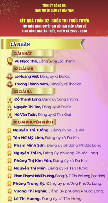 Ban Tuyên giáo và Dân vận Tỉnh ủy Đồng Nai trân trọng thông báo và chúc mừng các cá nhân, tập thể đã đạt thành tích xuất sắc trong Tuần thi thứ 2 của Cuộc thi trực tuyến tìm hiểu Nghị quyết Đại hội Đại biểu Đảng bộ tỉnh Đồng Nai lần thứ I, nhiệm kỳ 2025-2030.