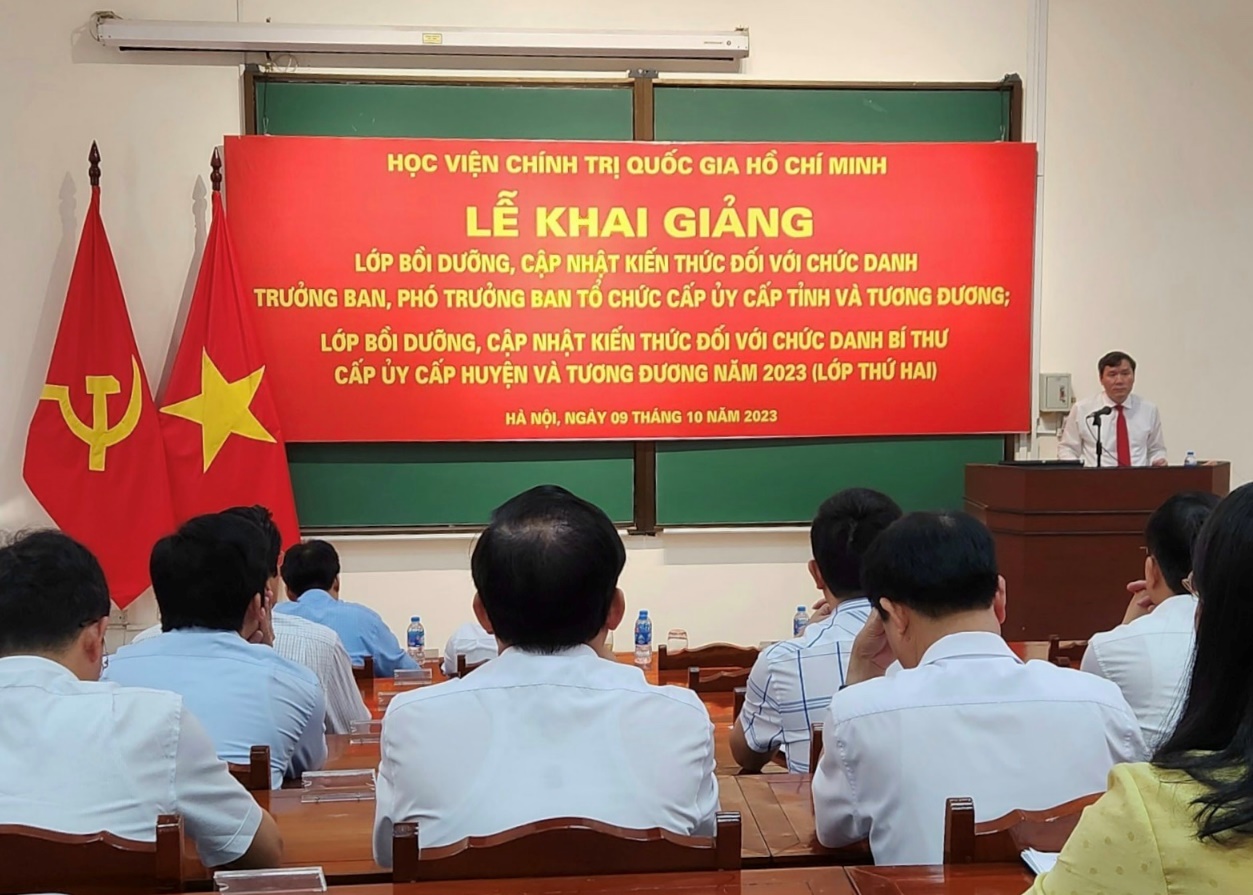 Sáng ngày 09/10/2023, Học viện Chính trị Quốc gia Hồ Chí Minh đã tổ chức khai giảng lớp bồi dưỡng, cập nhật kiến thức đối với chức danh Trưởng Ban, Phó Trưởng BTC cấp ủy cấp tỉnh và chức danh Bí thư cấp ủy cấp huyện và tương đương (lớp thứ hai), thời gian học từ ngày 09/10/2023 đến 13/10/2023.