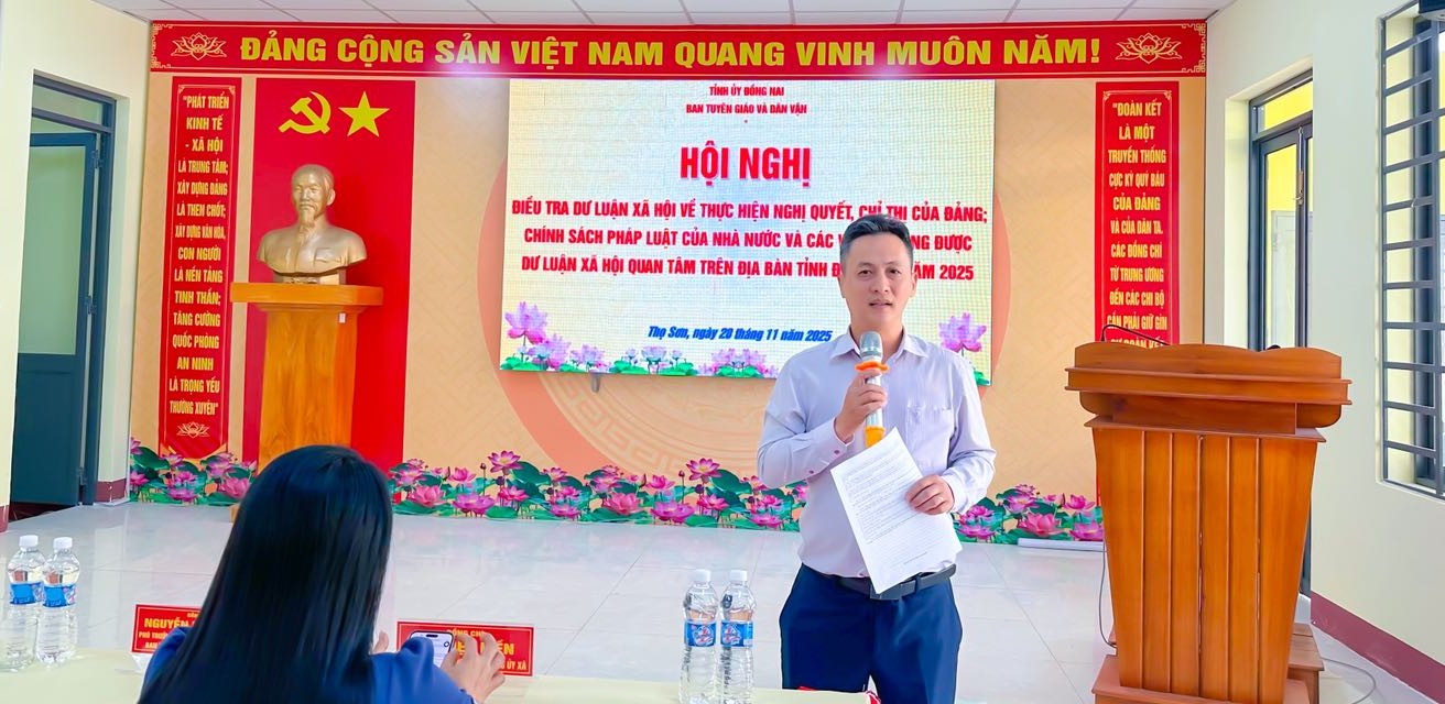 Thực hiện Quyết định số 08-QĐ/BTGDVTU ngày 19/11/2025 của Ban Tuyên giáo và Dân vận Tỉnh ủy về ban hành Phương án điều tra dư luận xã hội năm 2025, ngày 28-11-2025, Ban Tuyên giáo và Dân vận Tỉnh ủy đã tổ chức đồng loạt nhiều cuộc khảo sát dư luận xã hội tại các xã: Tân Tiến, Lộc Thạnh, Hưng Phước, Thiện Hưng, Phú Hòa, Định Quán, Gia Kiệm, Thống Nhất, Đồng Phú, Tân Lợi, Đồng Tâm, Phú Trung, Thọ Sơn, Bù Đăng, Nghĩa Trung và Phước Sơn. Đây là hoạt động thường niên nhằm nắm bắt tâm tư, nguyện vọng, đánh giá của cán bộ, đảng viên và các tầng lớp Nhân dân đối với việc thực hiện chủ trương, đường lối của Đảng và chính sách, pháp luật của Nhà nước trên địa bàn tỉnh.