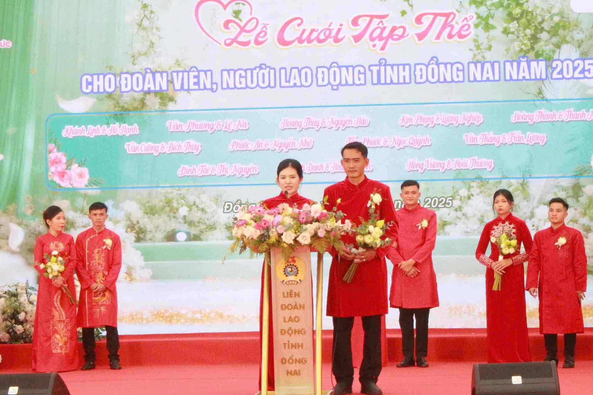 Chia sẻ tại buổi lễ, chị Hoàng Thị Thanh, công nhân Công ty TNHH sản xuất giày dép Grand Gain, xúc động cho biết sau hơn 16 năm chung sống, chị chưa từng nghĩ có ngày được khoác áo cưới, trao nhẫn trước sự chứng kiến của gia đình, bạn bè. Lễ cưới tập thể do tổ chức Công đoàn tỉnh Đồng Nai tổ chức là kỷ niệm đặc biệt, tiếp thêm niềm tin và động lực để các gia đình công nhân yên tâm lao động, gắn bó lâu dài.
