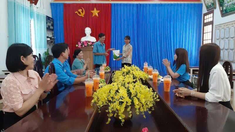 Các đồng chí lãnh đạo LĐLĐ huyện cùng với đoàn viên công đoàn Phạm Thị Yến