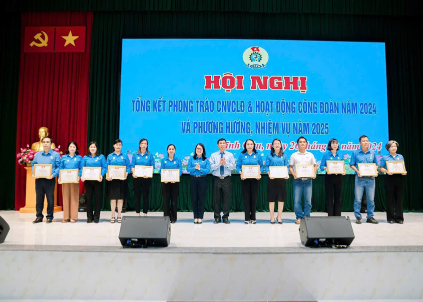 Tại hội nghị, LĐLĐ huyện Vĩnh Cửu đề xuất LĐLĐ tỉnh đã tặng bằng khen cho 17 tập thể, 19 cá nhân; UBND huyện Vĩnh Cửu tặng giấy khen cho 05 tập thể và 10 cá nhân và LĐLĐ huyện trao giấy khen cho 31 tập thể, 35 cá nhân có thành tích xuất sắc trong phong trào công nhân viên chức lao động năm 2024.