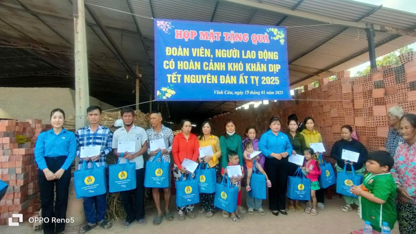 Thực hiện chương trình “Tết Sum vầy năm 2025” và đảm bảo tất cả các đoàn viên Công đoàn, người lao động đều có Tết. Thời gian qua, LĐLĐ huyện đã chỉ đạo các Công đoàn trực thuộc, Công đoàn cơ sở và doanh nghiệp trên địa bàn huyện quan tâm, chăm lo cho các đoàn viên, người lao động trong đơn vị mình. Đồng thời, lựa chọn những đoàn viên, người lao động có hoàn cảnh đặc biệt khó khăn để đề xuất LĐLĐ tỉnh, LĐLĐ huyện hỗ trợ quà Tết. Tại buổi lễ, đồng chí Nguyễn Thị Minh Châu, HUV - Chủ tịch LĐLĐ huyện đã trao 50 phần quà cho 50 đoàn viên Công đoàn, người lao động nghèo, có hoàn cảnh khó khăn đang ở trọ trên địa bàn xã Thiện Tân (huyện Vĩnh Cửu), mỗi phần quà trị giá 1,0 triệu đồng.