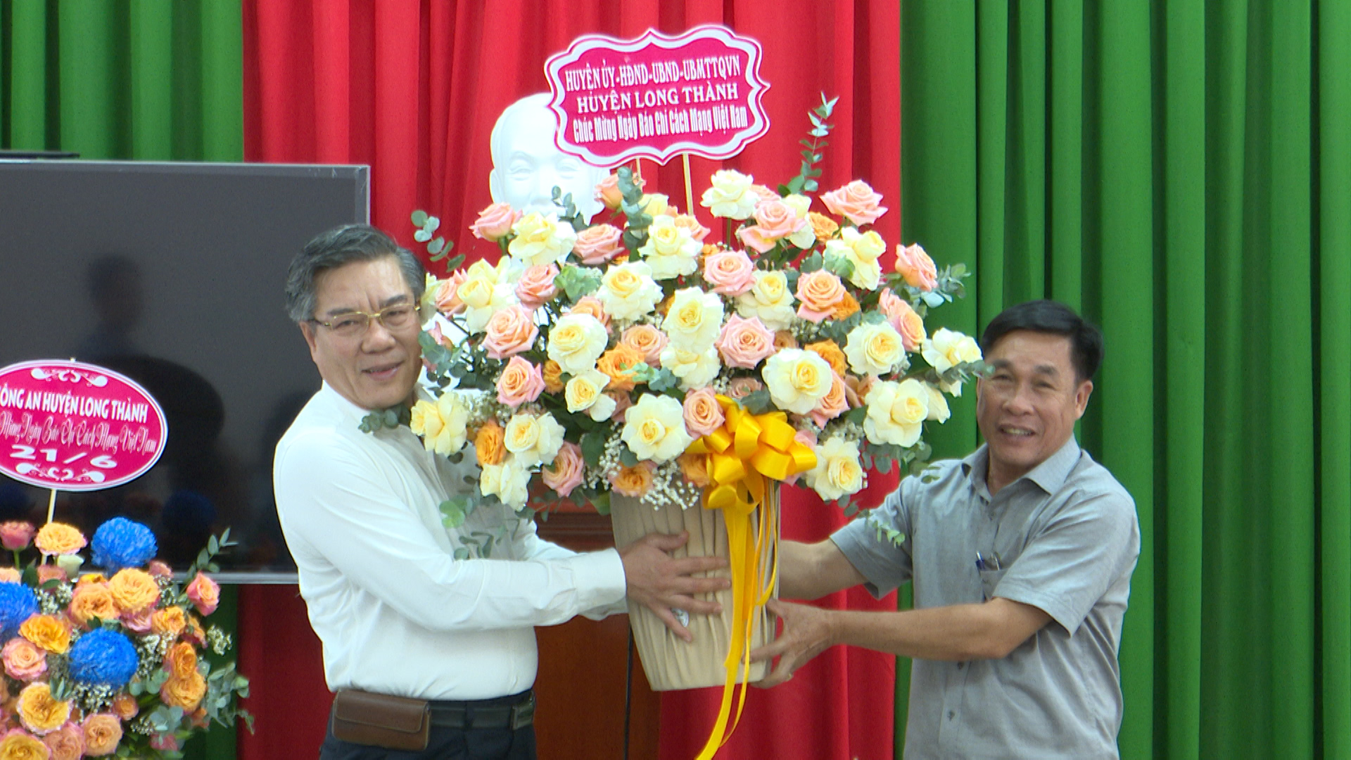 Đ/c Dương Minh DŨng - UVTV Tỉnh ủy, Bí thư Huyện ủy Long Thành tặng hoa chúc mừng Ngày Báo chí Cách mạng Việt Nam