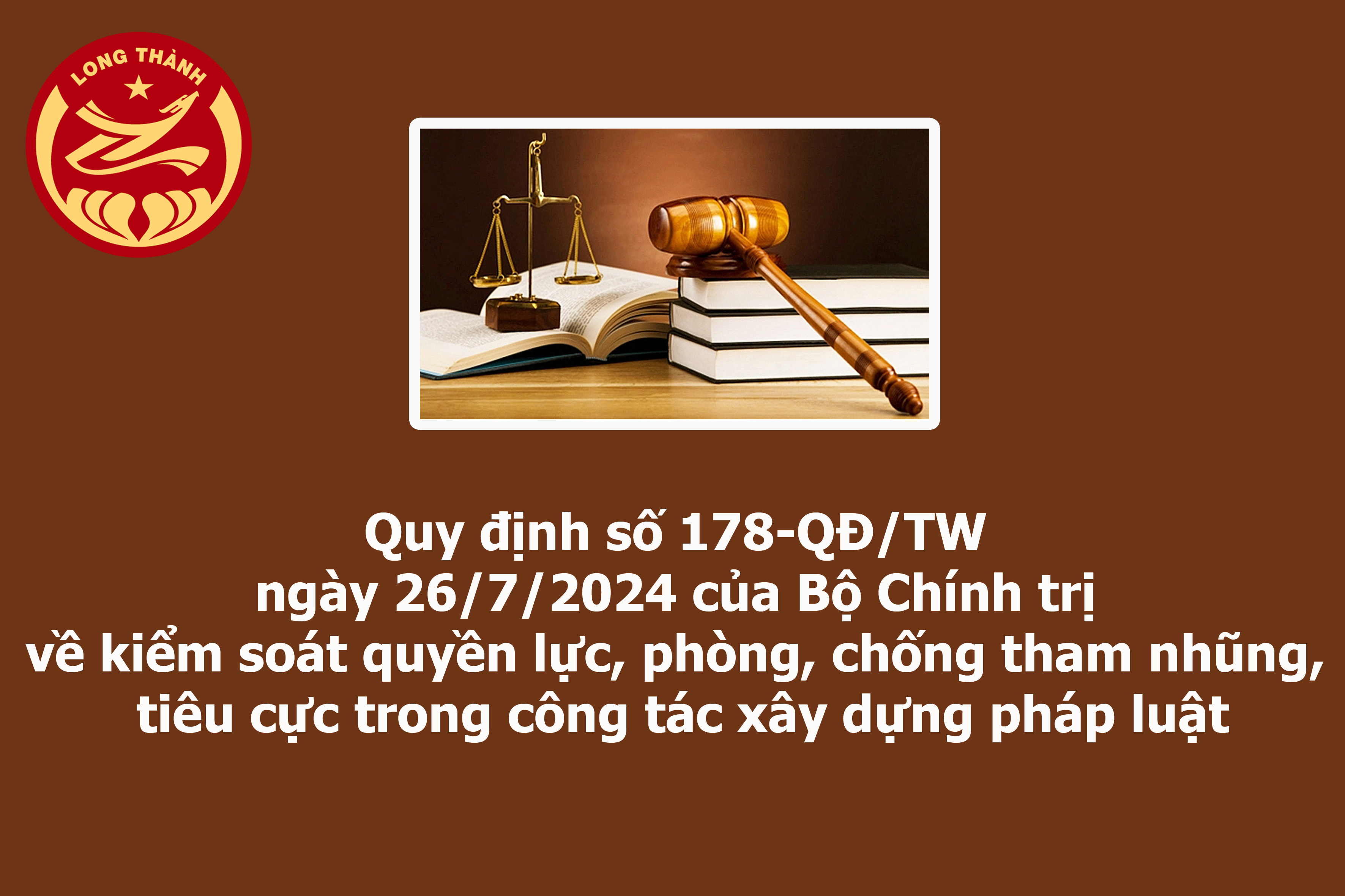 Quy định 178-QĐ/TW về kiểm soát quyền lực, phòng, chống tham nhũng, tiêu cực trong công tác xây dựng pháp luật được Bộ Chính trị ký ban hành ngày 27/6/2024, gồm có 04 chương, 18 điều. Quy định về nguyên tắc kiểm soát; phương thức kiểm soát; các hành vi tham nhũng, tiêu cực trong công tác xây dựng pháp luật; trách nhiệm của cấp ủy, tổ chức đảng, của cơ quan, tổ chức, người đứng đầu, cán bộ, công chức, viên chức có thẩm quyền trong công tác xây dựng pháp luật và việc xử lý trách nhiệm khi để xảy ra hành vi vi phạm, tham nhũng, tiêu cực trong công tác xây dựng pháp luật.