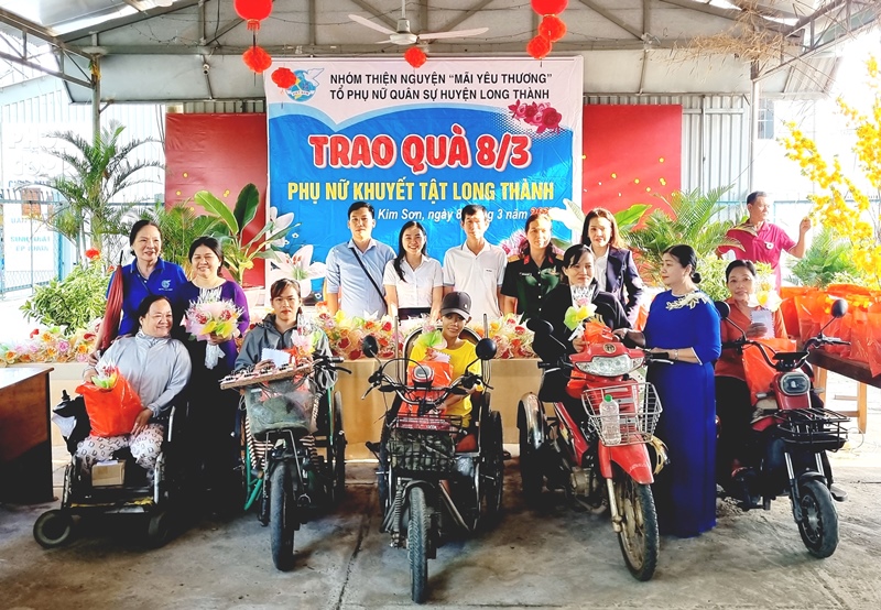 Chị Nguyễn Thị Thúy Loan-Người khuyết tật ở thị trấn Long Thành phấn khởi nói: Hồi trước em chưa được chính quyền địa phương hỗ trợ cho chiếc xe lắc, em ở nhà phụ thuộc vào gia đình nuôi sống bản thân. Từ lúc em được chính quyền địa phương cho chiếc xe lắc để làm phương tiện đi bán vé số, em đã tự nuôi sống được bản thân, có thể phụ giúp cho gia đình và nuôi con. Chiếc xe này có thể giúp em đưa rước con đi học hàng ngày, có thể đi chợ, mình muốn đi đâu, muốn mua cái gì sẽ không cần phải nhờ người khác nữa. Chị Nguyễn Hồng Cẩm-Người khuyết tật ở thị trấn Long Thành bày tỏ: Được các cấp lãnh đạo, chính quyền quan tâm tặng quà vào những dịp lễ, Tết, đặc biệt là ngày 08/03. Đối với tụi em, tuy phần quà không có giá trị gì nhiều nhưng đó là niềm động viên để tạo cho tụi em có một cái không khí, động lực trong lòng để cố gắng vượt lên cải thiện cuộc sống của tụi em có ý nghĩa hơn. Thiếu tá Đoàn Thị Kim Thanh-Chủ tịch Hội Phụ nữ Ban Chỉ huy quân sự huyện Long Thành chia sẽ: Đối với những người phụ nữ khuyết tật thì các cô, các chị sẽ gặp rất nhiểu khó khăn trong cuộc sống. Chính vì vậy hàng năm, ngoài hoạt động phụ nữ 08/03 tại đơn vị, Hội Phụ nữ Ban Chỉ huy quân sự huyện Long Thành kết hợp với nhóm “Mãi yêu thương” và các mạnh thường quân, trao những phần quà cho các chị em phụ nữ khuyết tật trên địa bàn thị trấn Long Thành. Mong các cô lạc quan yêu đời cống hiến sức mình cho xã hội, đỡ gánh nặng cho gia đình và xã hội.