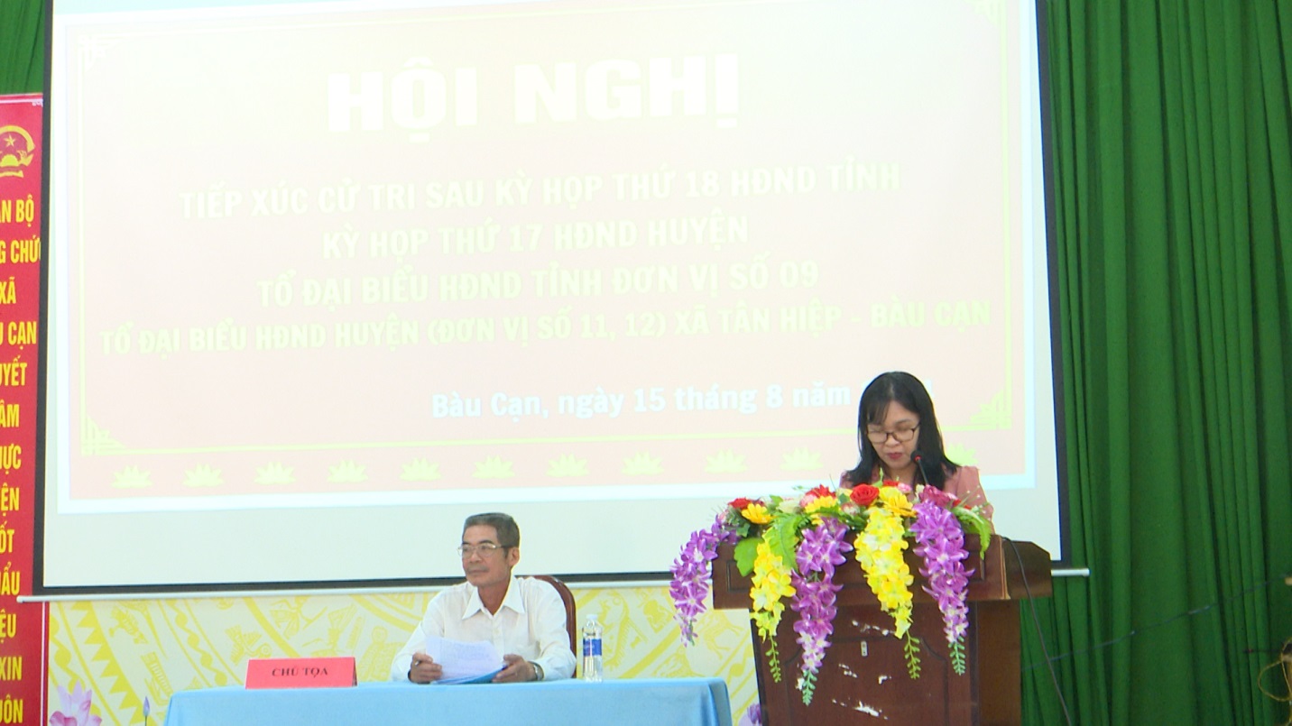 Bà Nguyễn Thị Thùy Linh - Phó giám đốc Sở Khoa học và công nghệ, đại biểu HĐND tỉnh phát biểu tại buổi tiếp xúc cử tri xã Bàu Cạn