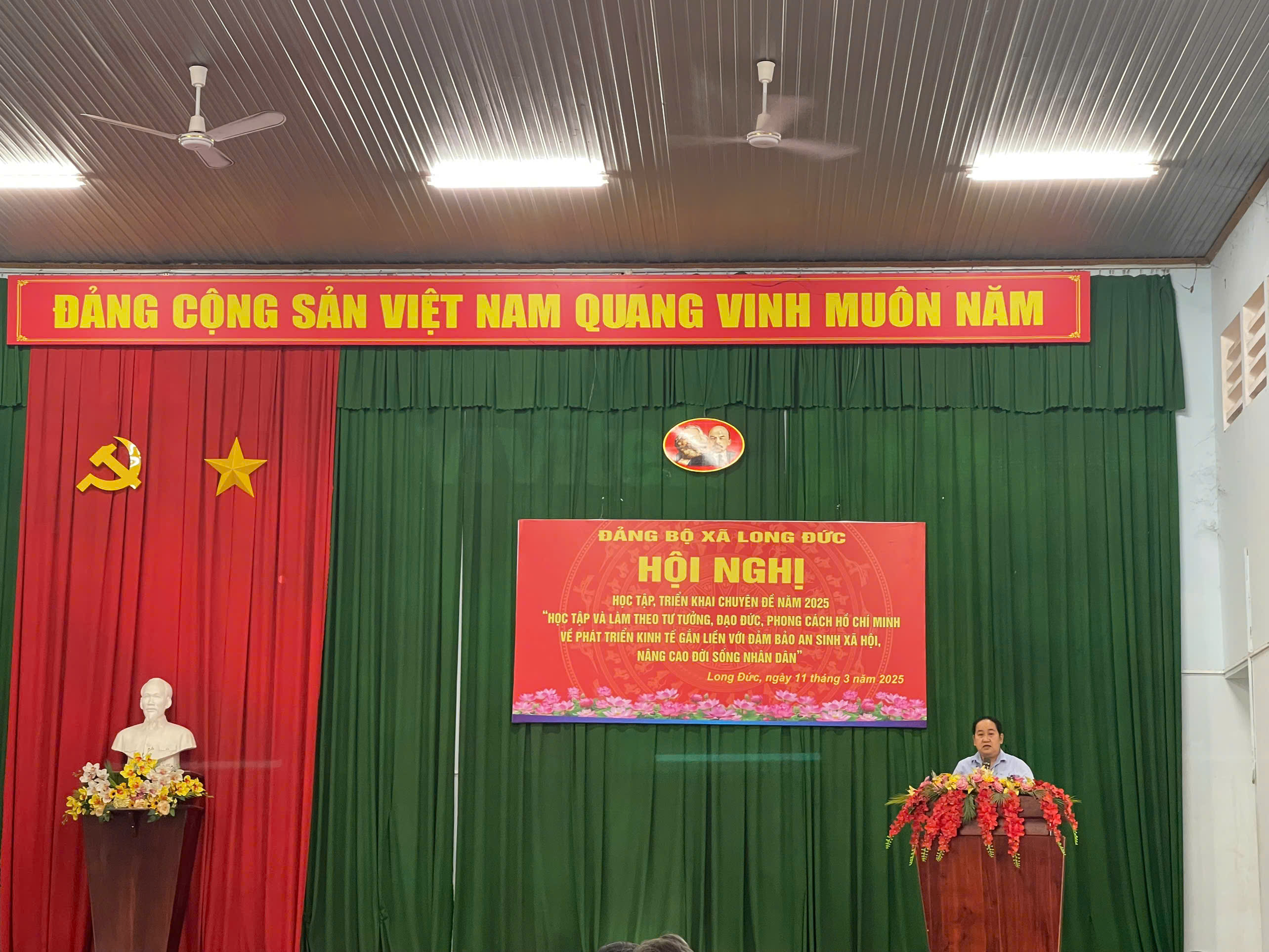Sáng ngày 11/3/2025 Đảng bộ xã Long Đức tổ chức Hội nghị học tập triển khai thực hiện chuyên đề năm 2025 “Học tập và làm theo tư tưởng, đạo đức, phong cách Hồ Chí Minh về về phát triển kinh tế gắn liền với đảm bảo an sinh xã hội, nâng cao đời sống Nhân dân” trong toàn Đảng bộ xã.