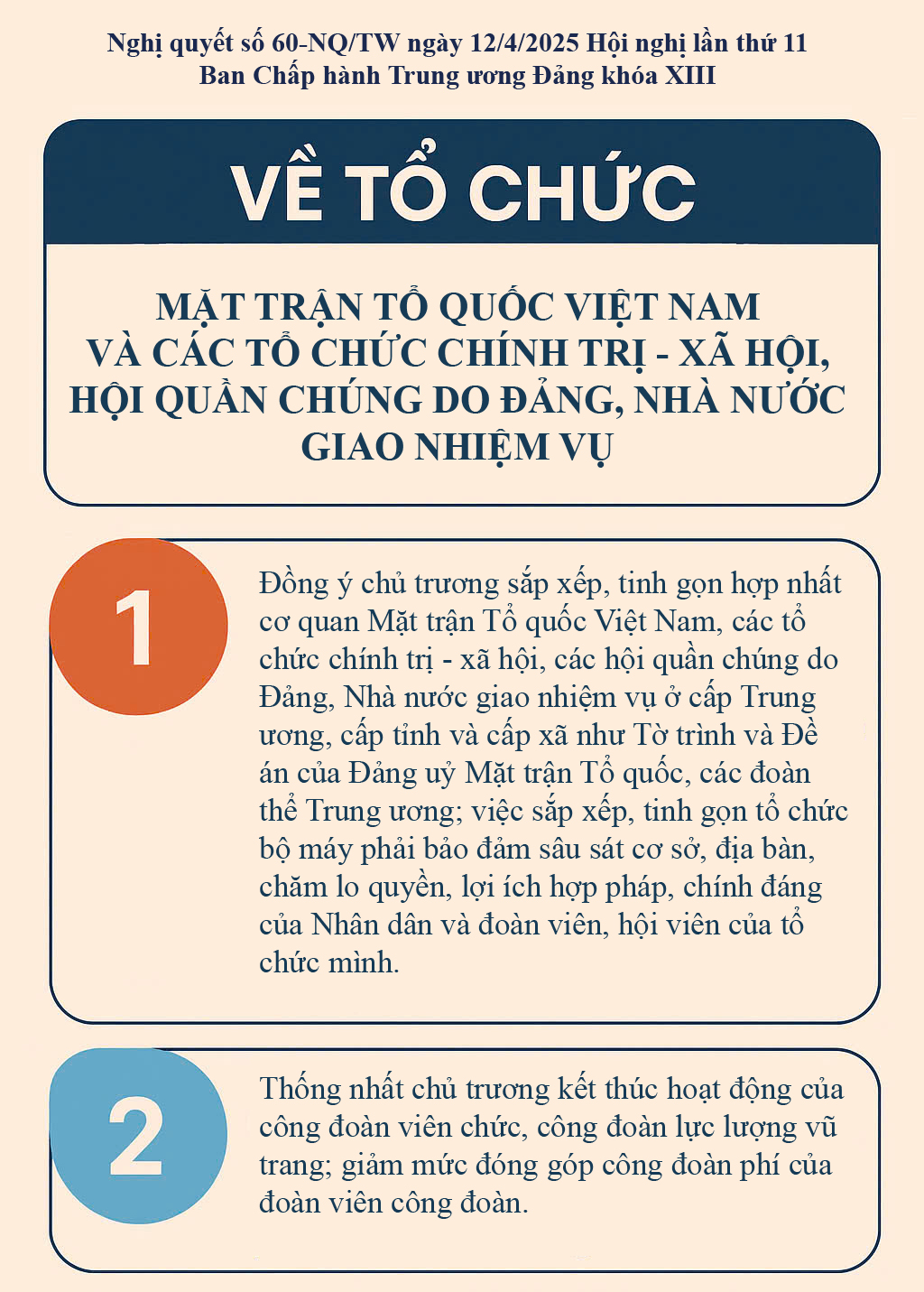 - Về tổ chức Mặt trận Tổ quốc Việt Nam và các tổ chức chính trị - xã hội, hội quần chúng do Đảng, Nhà nước giao nhiệm vụ: (1) Đồng ý chủ trương sắp xếp, tinh gọn hợp nhất cơ quan Mặt trận Tổ quốc Việt Nam, các tổ chức chính trị - xã hội, các hội quần chúng do Đảng, Nhà nước giao nhiệm vụ ở cấp Trung ương, cấp tỉnh và cấp xã như Tờ trình và Đề án của Đảng uỷ Mặt trận Tổ quốc, các đoàn thể Trung ương; việc sắp xếp, tinh gọn tổ chức bộ máy phải bảo đảm sâu sát cơ sở, địa bàn, chăm lo quyền, lợi ích hợp pháp, chính đáng của Nhân dân và đoàn viên, hội viên của tổ chức mình. (2) Thống nhất chủ trương kết thúc hoạt động của công đoàn viên chức, công đoàn lực lượng vũ trang; giảm mức đóng góp công đoàn phí của đoàn viên công đoàn.