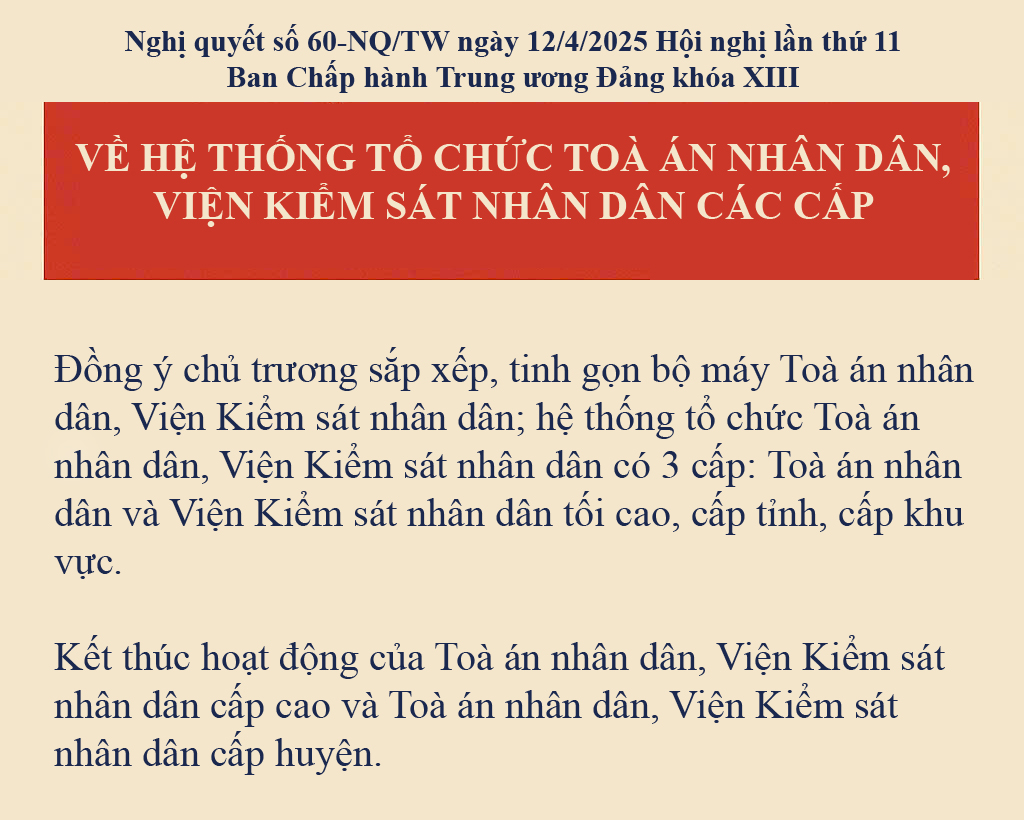 - Về hệ thống tổ chức Toà án nhân dân, Viện kiểm sát nhân dân các cấp: Đồng ý chủ trương sắp xếp, tinh gọn bộ máy Toà án nhân dân, Viện Kiểm sát nhân dân; hệ thống tổ chức Toà án nhân dân, Viện Kiểm sát nhân dân có 3 cấp: Toà án nhân dân và Viện Kiểm sát nhân dân tối cao, cấp tỉnh, cấp khu vực. Kết thúc hoạt động của Toà án nhân dân, Viện Kiểm sát nhân dân cấp cao và Toà án nhân dân, Viện Kiểm sát nhân dân cấp huyện.