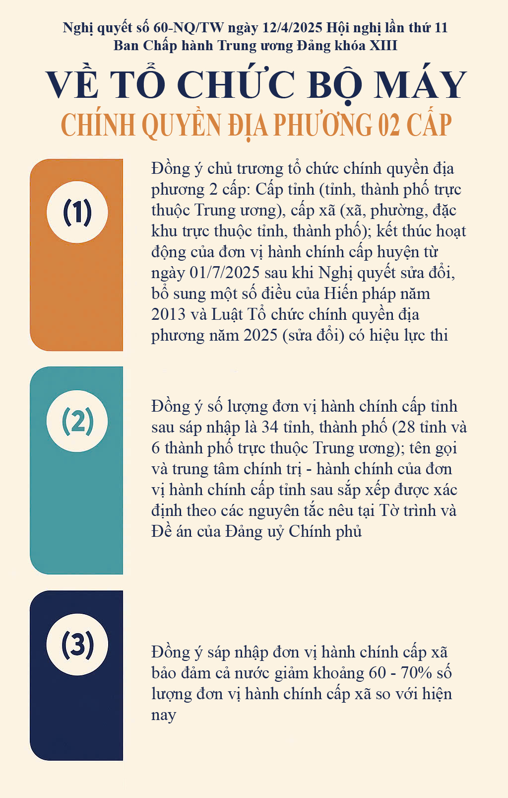 - Về tổ chức bộ máy chính quyền địa phương 2 cấp: (1) Đồng ý chủ trương tổ chức chính quyền địa phương 2 cấp: Cấp tỉnh (tỉnh, thành phố trực thuộc Trung ương), cấp xã (xã, phường, đặc khu trực thuộc tỉnh, thành phố); kết thúc hoạt động của đơn vị hành chính cấp huyện từ ngày 01/7/2025 sau khi Nghị quyết sửa đổi, bổ sung một số điều của Hiến pháp năm 2013 và Luật Tổ chức chính quyền địa phương năm 2025 (sửa đổi) có hiệu lực thi hành. (2) Đồng ý số lượng đơn vị hành chính cấp tỉnh sau sáp nhập là 34 tỉnh, thành phố (28 tỉnh và 6 thành phố trực thuộc Trung ương); tên gọi và trung tâm chính trị - hành chính của đơn vị hành chính cấp tỉnh sau sắp xếp được xác định theo các nguyên tắc nêu tại Tờ trình và Đề án của Đảng uỷ Chính phủ (Danh sách chi tiết kèm theo). (3) Đồng ý sáp nhập đơn vị hành chính cấp xã bảo đảm cả nước giảm khoảng 60 - 70% số lượng đơn vị hành chính cấp xã so với hiện nay.