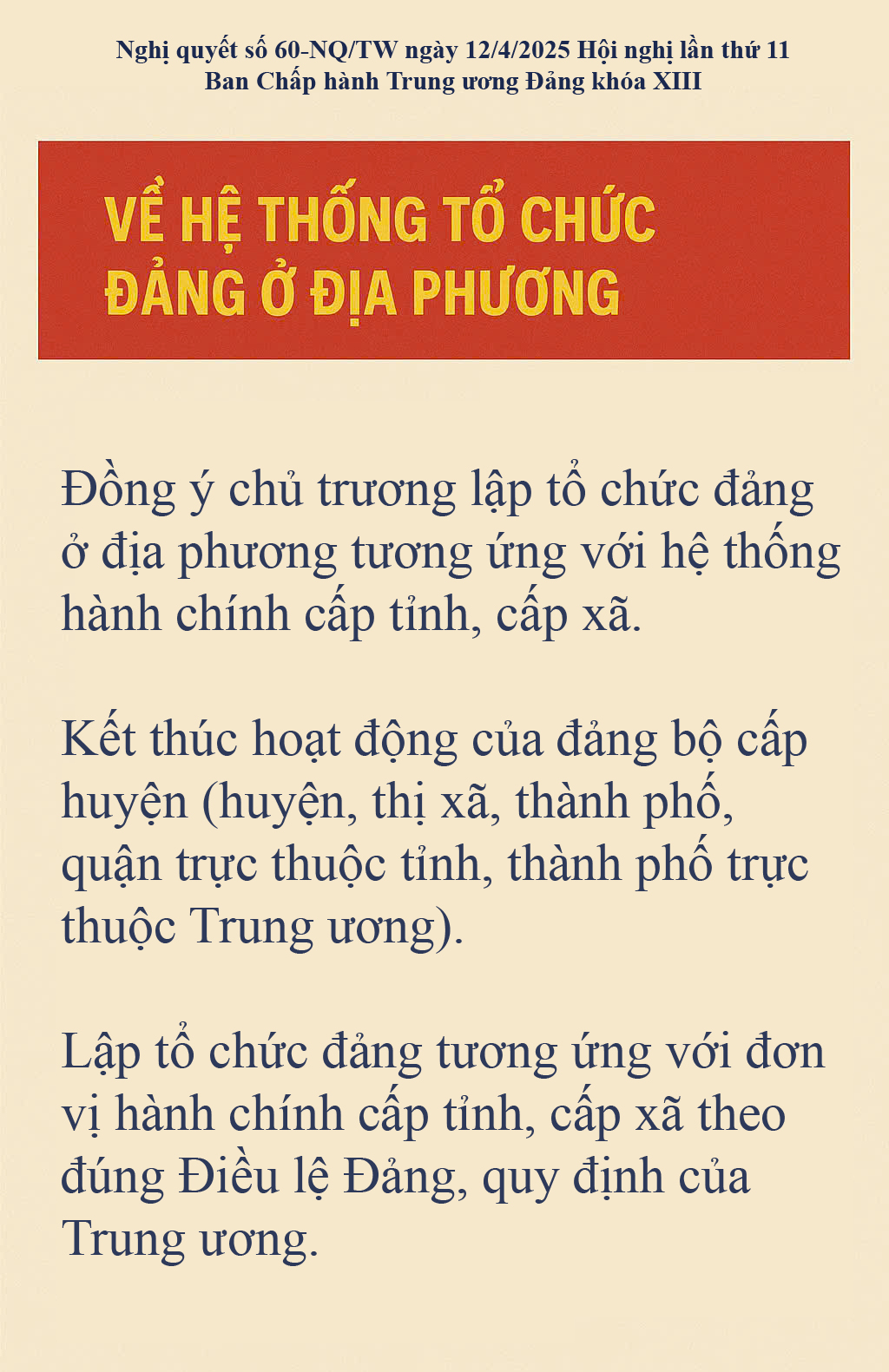 - Về hệ thống tổ chức đảng ở địa phương: Đồng ý chủ trương lập tổ chức đảng ở địa phương tương ứng với hệ thống hành chính cấp tỉnh, cấp xã. Kết thúc hoạt động của đảng bộ cấp huyện (huyện, thị xã, thành phố, quận trực thuộc tỉnh, thành phố trực thuộc Trung ương). Lập tổ chức đảng tương ứng với đơn vị hành chính cấp tỉnh, cấp xã theo đúng Điều lệ Đảng, quy định của Trung ương.