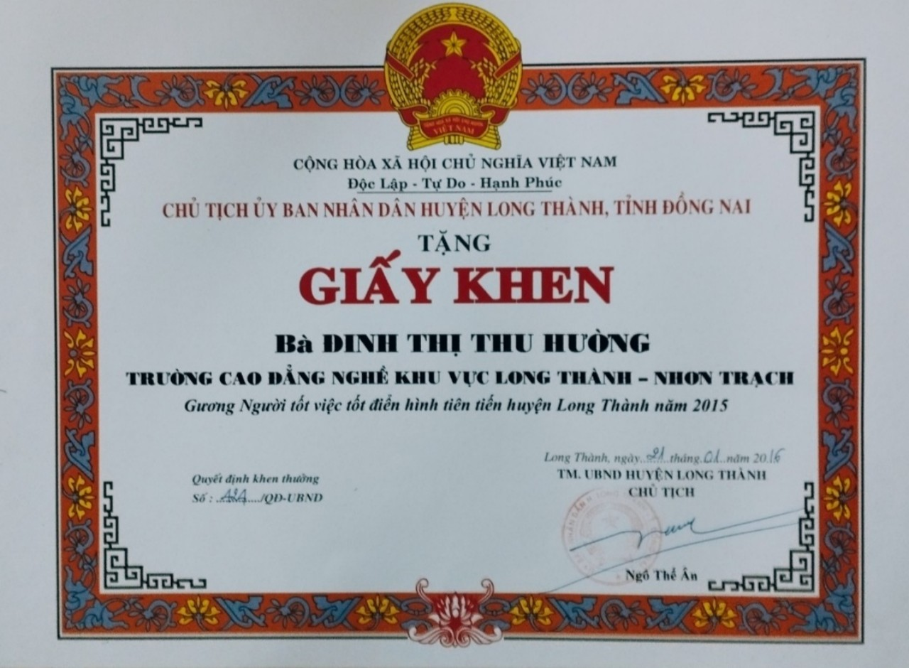 Ngày 21/01/2016, tôi đã vinh dự được Chủ tịch ủy ban nhân dân huyện Long Thành trao tặng giấy khen Gương người tốt việc tốt điển hình tiên tiến huyện Long Thành năm 2015.