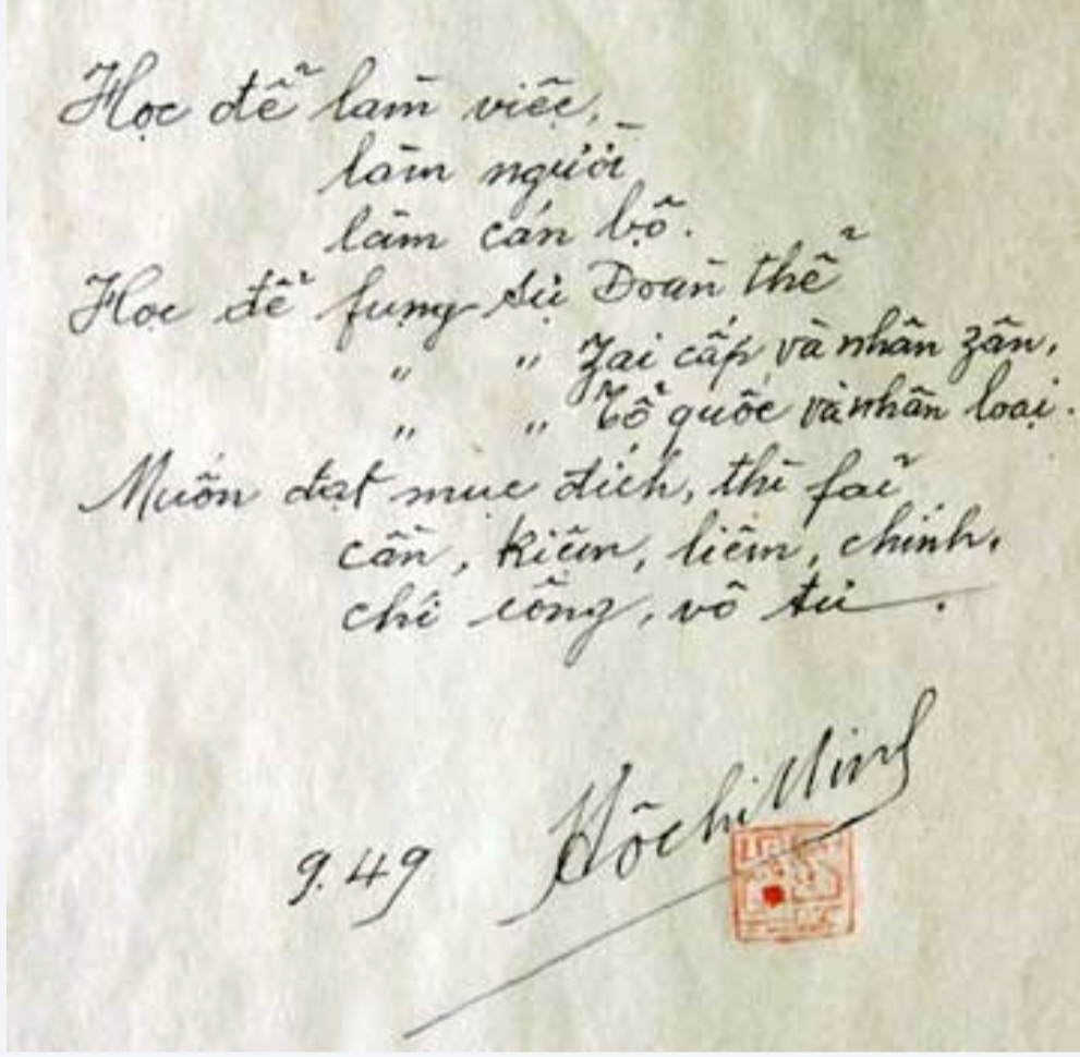 (Chủ tịch Hồ Chí Minh ghi trong trang đầu quyển sổ vàng khi đến thăm Trường Đảng Trung ương Nguyễn Ái Quốc vào tháng 9 năm 1949 - nay là Học viện Chí trị quốc gia Hồ Chí Minh)