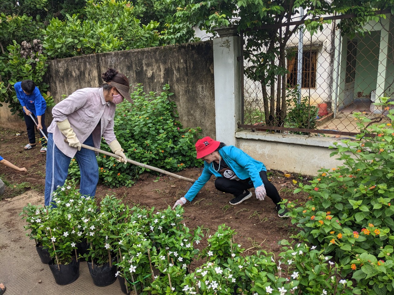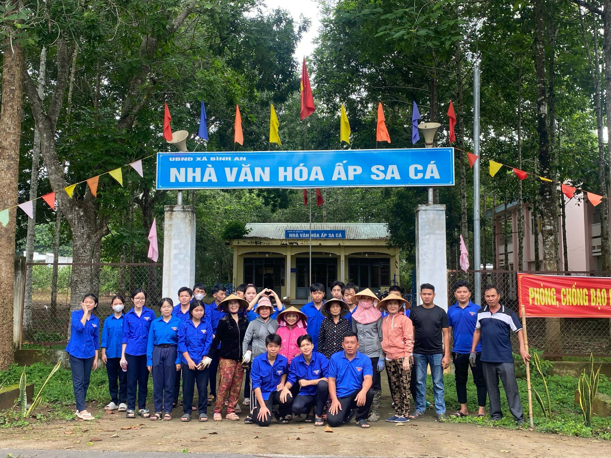 Phụ nữ ấp Sa Cá và đoàn viên thanh niên tham gia trồng cây và dọn dẹp vệ sinh