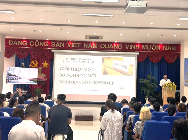 Tại hội nghị, người nộp thuế, cá nhân kinh doanh đã được nghe bà Đặng Thị Thanh Huyền- Tổ trưởng Tổ nghiệp vụ, Dự toán, Pháp chế- Đội Thuế liên huyện Long Thành - Nhơn Trạch triển khai một số nội dung mới của Nghị Định số 70/2025/NĐ-CP ngày 20/3/2025 của Chính Phủ sửa đổi, bổ sung Nghị định số 123/2020/NĐ-CP ngày 19/10/2020 của Chính Phủ quy định về hóa đơn, chứng từ (có hiệu lực thi hành kể từ ngày 01/6/2025); Các quy định về áp dụng Hóa đơn điện tử khởi tạo từ máy tính tiền có kết nối chuyển dữ liệu điện tử với cơ quan thuế.