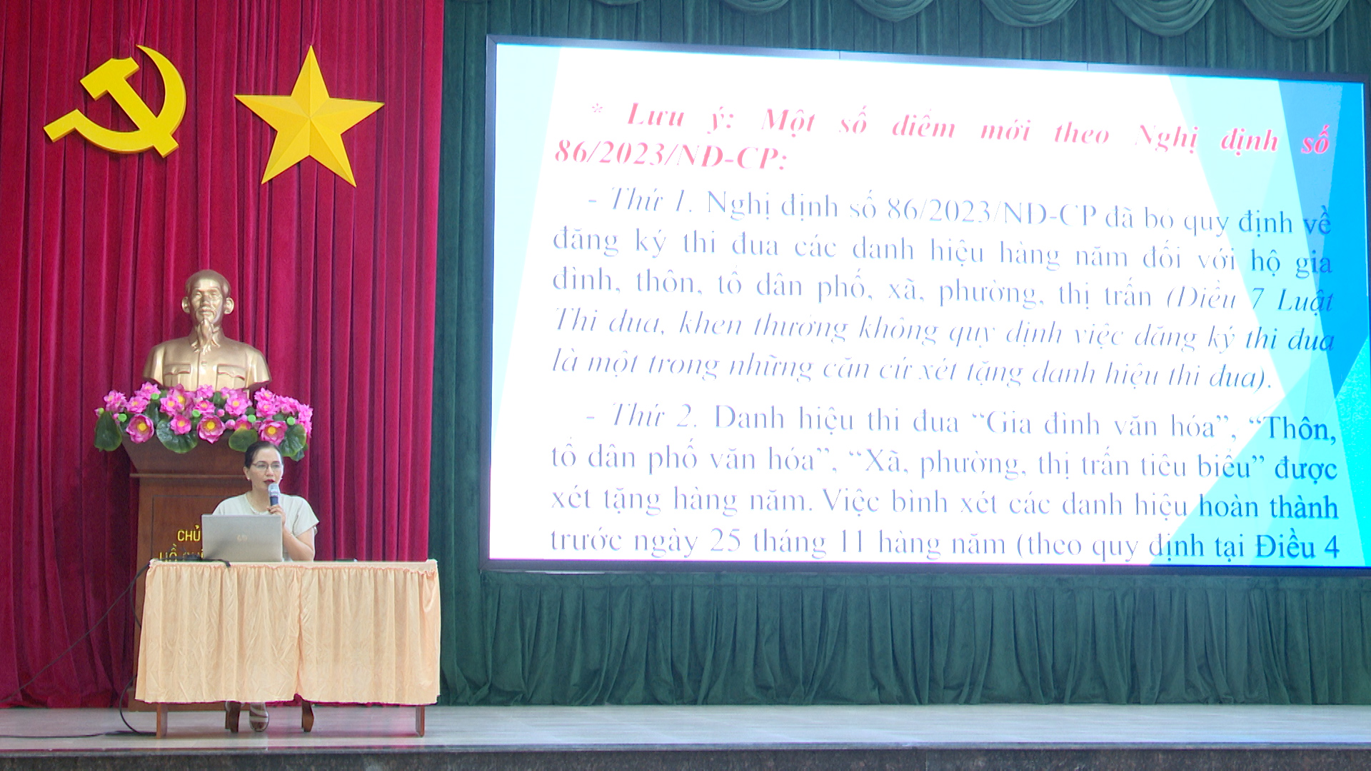 Tại hội nghị, các đại biểu được nghe đồng chí Trần Anh Thơ – Trưởng phòng Quản lý văn hóa và gia đình – Sở Văn hóa Thể thao và Du lịch tỉnh Đồng Nai triển khai các nội dung gồm: Nghị định số 61 ngày 16/8/2023 của Chính phủ về xây dựng và thực hiện hương ước, quy ước của cộng đồng dân cư; Nghị định số 86 ngày 7/12/2023 của Chính phủ quy định về khung tiêu chuẩn và trình tự, thủ tục, hồ sơ xét tặng danh hiệu “ gia đình văn hóa”, “Thôn, tổ dân phố văn hóa”, “ xã, phường, thị trấn tiêu biểu”.