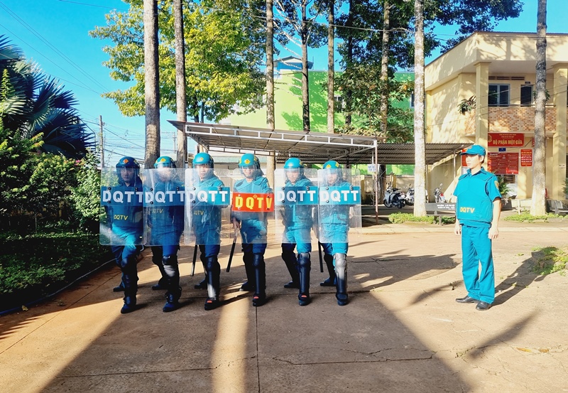 Về công tác xây dựng lực lượng Dân quân tự vệ. Căn cứ Thông tư số 77 của Bộ Quốc phòng và Đề án số 989 của UBND tỉnh, trong 05 năm qua, đã xây dựng tổng số hơn 15.000 Dân quân tự vệ đạt 1,04% so dân số (Trong đó, Dân quân gần 11.800 người, tự vệ gần 3.300 người) được tổ chức ở 88 khu, ấp; 14 xã, thị trấn; 10 Ban CHQS cơ quan, tổ chức; 24 đơn vị tự vệ; 4 trung đội Khu công nghiệp và các đơn vị của huyện với quy mô 02 đại đội, 20 trung đội, 126 tiểu đội, 14 khẩu đội và 140 tổ biên chế thành các đơn vị Dân quân tự vệ thường trực, cơ động, tại chỗ và Dân quân binh chủng đảm bảo đủ các thành phần lực lượng theo Chỉ lệnh của Bộ CHQS tỉnh và phù hợp với kế hoạch phòng thủ của huyện. Chất lượng chính trị Đảng viên trong Dân quân tự vệ đạt 29,17% so với chỉ tiêu 29,15% (Trong đó, Dân quân đạt 26,46% so với chỉ tiêu 29,43%; tự vệ đạt 37,92%), Đoàn viên đạt 48,7% trong lực lượng. Cán bộ Chỉ huy trưởng, Phó Chỉ huy trưởng Ban CHQS xã, thị trấn được bổ nhiệm đã qua đào tạo ngành quân sự cơ sở, 13/13 đồng chí Chỉ huy trưởng tham gia cấp ủy; 16/16 đồng chí Phó Chỉ huy trưởng là Đảng viên; 14/14 xã, thị trấn thành lập Chi bộ quân sự (100% chi bộ quân sự có Chi ủy); 100% cán bộ khu, ấp đội trưởng là Đảng viên.