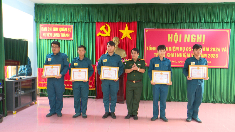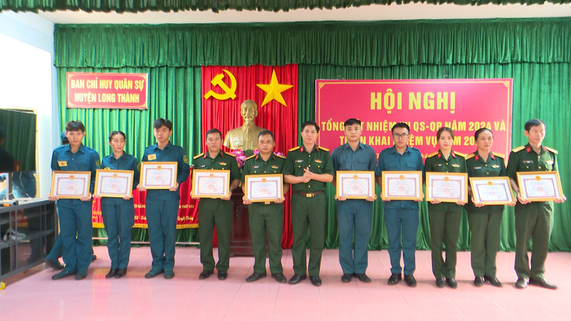 Dịp này, BCH quân sự huyện Long Thành đã tuyên dương 5 tập thể và 10 cá nhân đạt thành tích xuất sắc trong phong trào thi đua quyết thắng năm 2024.