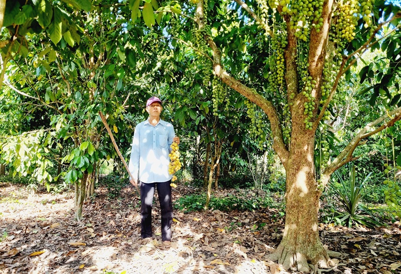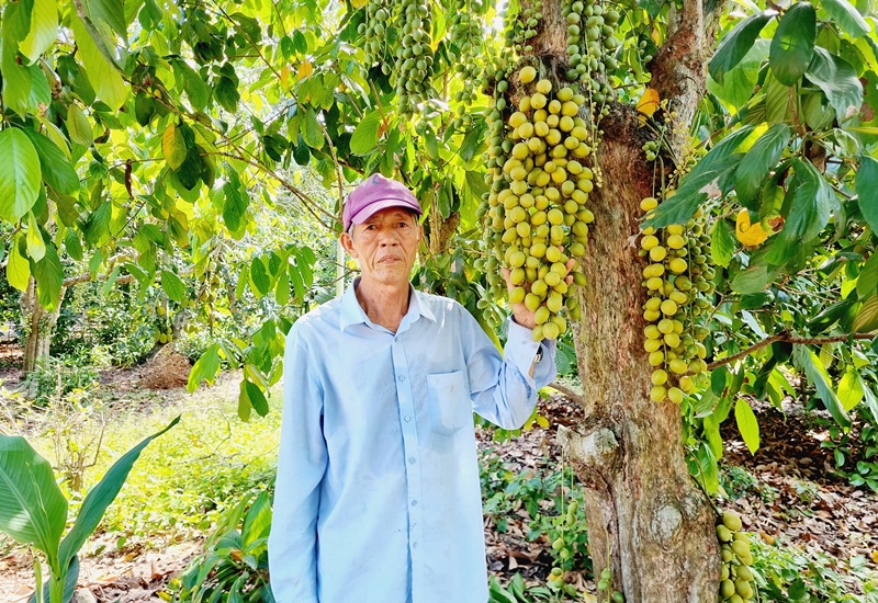 Theo đó, cách đây hơn 30 năm, ông Huỳnh Văn Sơn quyết định cải tạo khu vườn tạp của gia đình có diện tích gần 1 ha chuyển sang trồng tập trung cây dâu xiêm. Sau 5 năm, ông tiến hành tuyển chọn cây cho trái đạt năng suất, ngon ngọt nhất lai ghép ra khắp vườn. Tuy nhiên, vào mỗi vụ thu hoạch trước đây, ông Sơn thường rơi vào cảnh trái dâu bị dội chợ rớt giá, do đụng phải dâu miền Tây đưa về, song từ khi thực hiện xử lý cho cây dâu ra hoa, kết trái sớm đã giúp ông Sơn thoát được áp lực về giá cả. Hiện tại, trong khi nhiều vườn dâu trên địa bàn xã còn đang ra hoa, kết trái thì vườn dâu 70 cây của ông Sơn đã cho thu hoạch mỗi tuần gần 100 kg. Ông Huỳnh Văn Sơn-Chủ vườn dâu ở ấp 1, xã An Phước chia sẽ kinh nghiệm: Khi thu hoạch xong phải rong sạch cành, lá trong thân và ngoài nhánh, cây sẽ tức đâm bông ra. Còn nếu mà mình không rong để ra Giêng thì cây sẽ đâm chồi nhiều quá, không ra bông được. Làm ra trái sớm như vậy sẽ bán được giá hơn, còn nếu trái ra đúng vụ thì giá sẽ bị hạ xuống. Đầu mùa tôi bán được 40-50 ngàn đồng/kg, còn hiện giờ là 35 ngàn đồng/kg tại vườn.