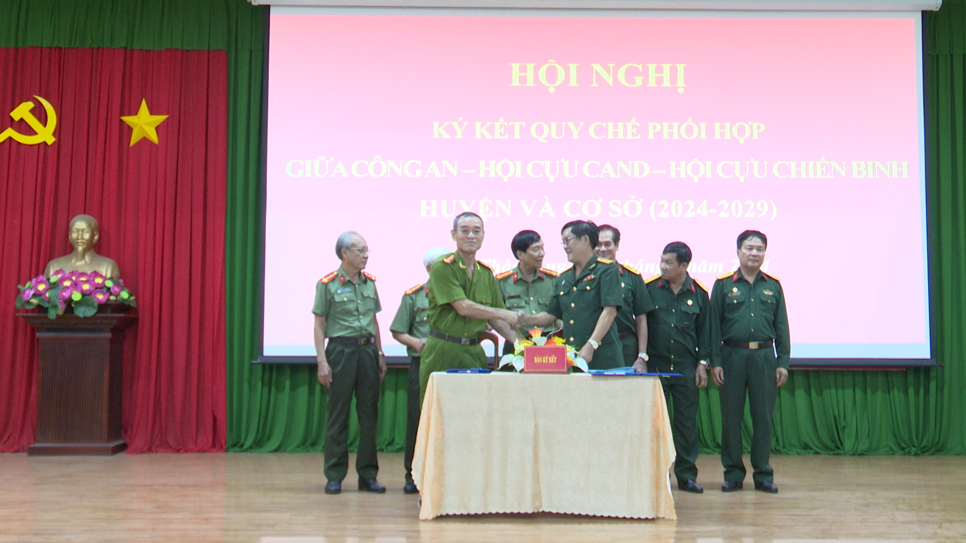 Bên cạnh đó, Hội cựu Công an nhân dân huyện cũng đã ký kết quy chế phối hợp với Hội cựu chiến binh huyện, trọng tâm là công tác tuyên truyền việc học tập và làm theo tư tưởng, đạo đức, phong cách Hồ Chí Minh, nâng cao bản lĩnh chính trị, đạo đức cách mạng của hội viên CCB và cựu CAND. Tuyên truyền, vận động hội viên thực hiện tốt các phong trào, các cuộc vận động tại địa phương như “Toàn dân đoàn kết xây dựng nông thôn mới, đô thị văn minh”; thi đua “dân vận khéo”, xây dựng khu phố, ấp an toàn về ANTT, thực hiện tốt công tác đấu tranh phòng, chống tội phạm, tệ nạn xã hội.