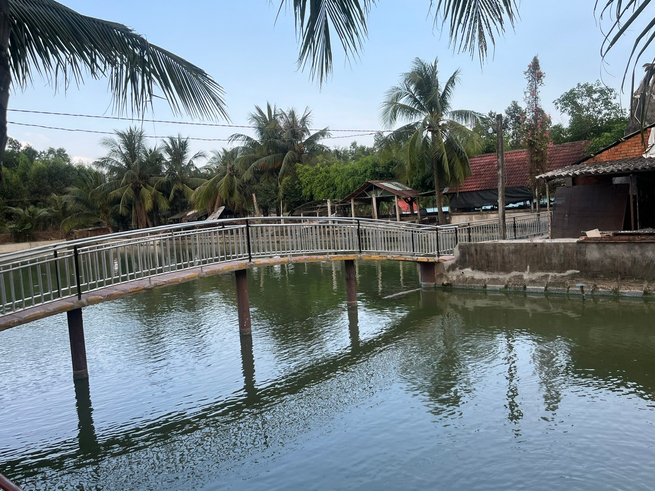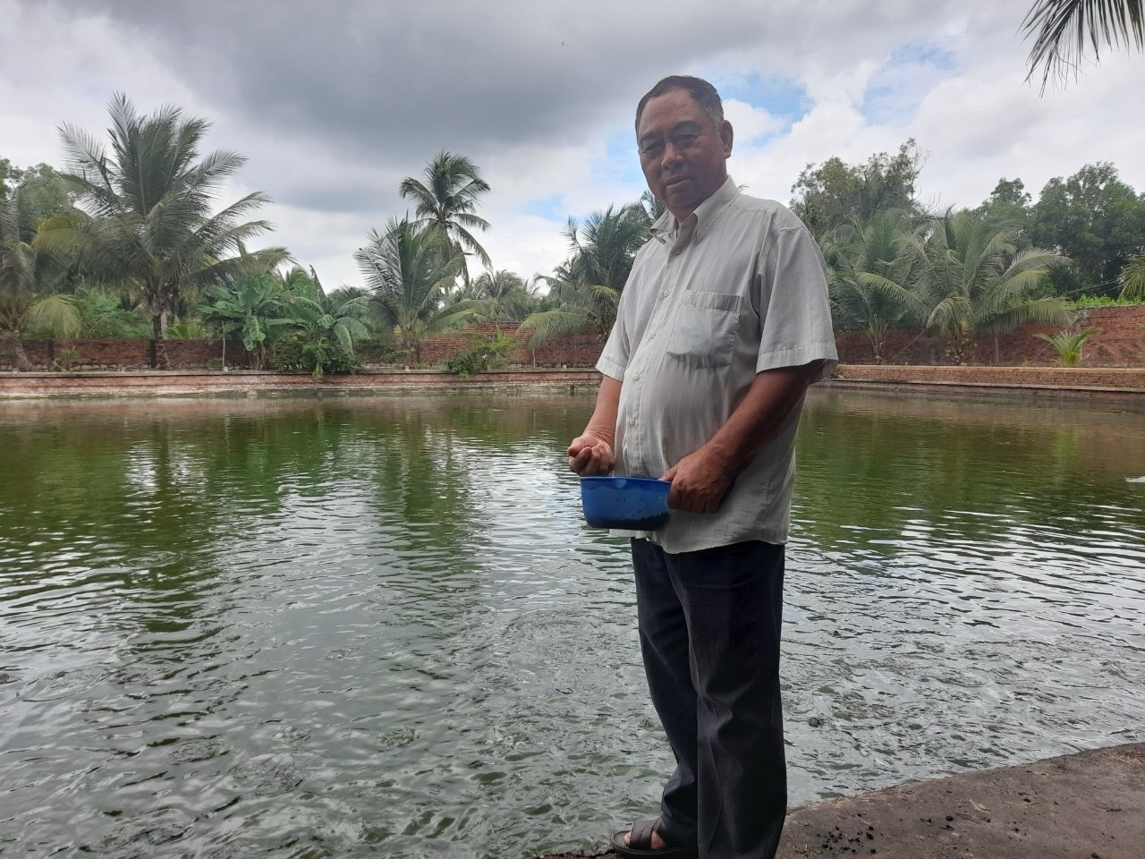 Ông Phạm Trọng Đại – Chi Hội Trưởng Nông dân ấp 3 bên Ao cá của gia đình