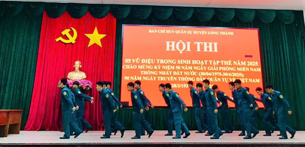 Chiều ngày 27/3/2025, tại hội trường UBND huyện, Bộ Chỉ huy Quan sự tỉnh đã tiến hành kiểm tra, chấm thi đối với Ban Chỉ huy Quân sự huyện Long Thành thực hiện “05 vũ điệu trong sinh hoạt tập thể”. Đến dự hội thi có đồng chí Thượng tá Nguyễn Tống Quế - Phó Chủ nhiệm Chính trị - Chủ khảo; đồng chí Thiếu tá Chủ nhiệm Nguyễn Đình Thân - nhiệm vụ Tuyên huấn Phòng Chính trị - thành viên Ban Giám Khảo; đồng chí Trung tá Hàn Ngọc Quang - Chính trị viên phó - Ban Chỉ huy Quân sự huyện Long Thành. Tại hội thi, tập thể Dân quân tự vệ Quân sự huyện Long Thành đã biểu diễn “05 vũ điệu trong sinh hoạt tập thể”, gồm: “Vũ điệu niềm tin”; “Vũ điệu quân dân”; “Vũ điệu hành quân”; “Vũ điệu lính trẻ” và “Vũ điệu hòa bình” và kiểm tra 15 bài hát quy định, 10 lời thề danh dự của quân nhân trong Lực lượng vũ trang.