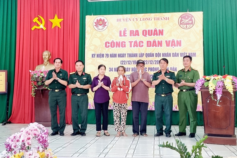 Tặng quà cho các hộ khó khăn trong đợt ra quân công tác dân vận tại xã Bàu Cạn