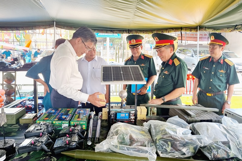 Giới thiệu với lãnh đạo tỉnh, huyện các mô hình học cụ tại Lễ ra quân huấn luyện chiến đấu năm 2024