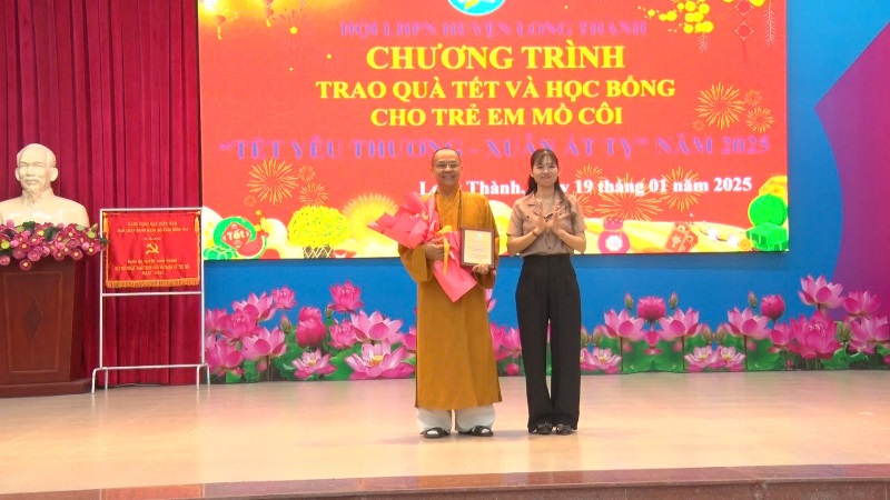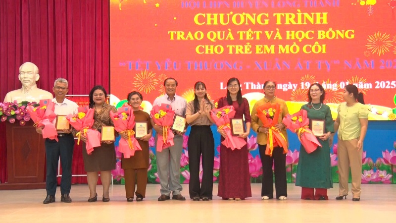 Bà Lê Hoàng Bảo Ngọc- Chủ tịch Hội liên hiệp phụ nữ huyện Long Thành trao bảng Tri ân cho các tổ chức và cá nhân đã hỗ trợ Hội Liên hiệp phụ nữ huyện thực hiện công tác chăm lo cho phụ nữ và trẻ em có hoàn cảnh khó khăn nhân dịp Tết Ất Tỵ 2025