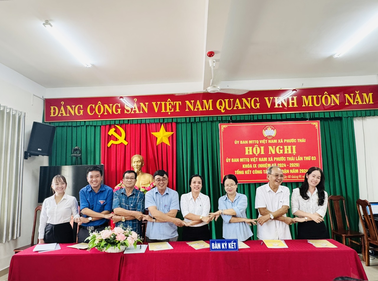 Chương trình phối hợp bám sát Nghị quyết số 60/NQ-ĐU ngày 27/12/2024 của Ban chấp hành Đảng bộ xã Phước Thái ( khoá XII) về chỉ tiêu, nhiệm vụ năm 2025; Nghị quyết Đại hội đại biểu UB.MTTQVN xã Phước Thái nhiệm kỳ 2024-2029. Ban thường trực UB.MTTQVN xã Phước thái ký kết chương trình phối hợp thực hiện cuộc vận động “ Toàn dân đoàn kết xây dựng nông thôn mới, kiểu mẫu, đô thị văn minh “ với Hội đồng nhân dân ( HĐND) xã ; Uỷ ban nhân dân (UBND) xã; công an xã; các tổ chức thành viên gồm: Hội liên hiệp phụ nữ (LHPN); Hội nông dân, Hội cựu chiến binh ( CCB); Đoàn thanh niên; Hội khuyến học; Hội người cao tuổi và Công đoàn xã nhằm cụ thể hoá chương trình phối hợp để phù hợp với đặc điểm, tình hình của địa phương.