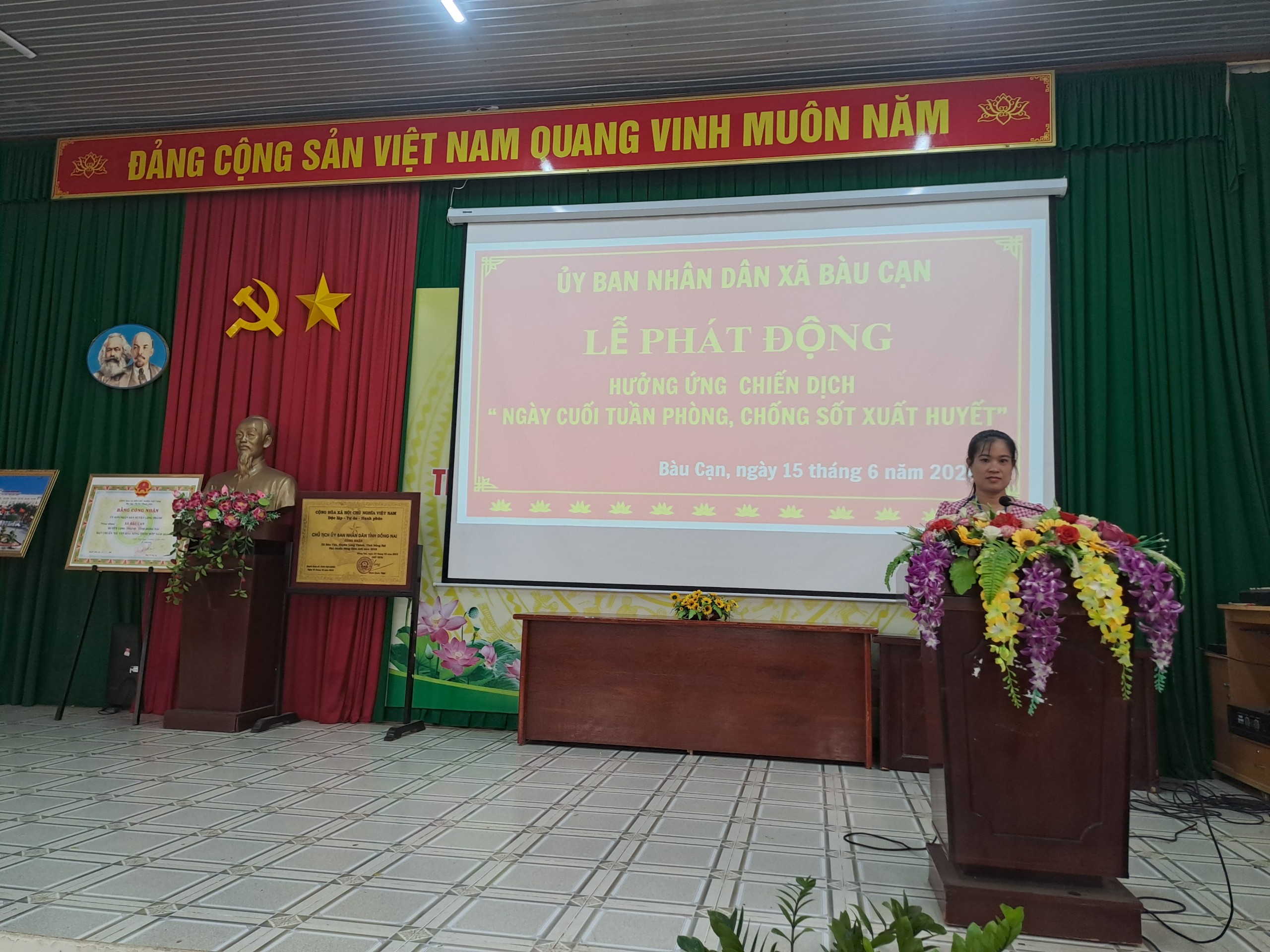 Thực hiện chỉ đạo của Chủ tịch UBND huyện Long Thành về việc tăng cường công tác phòng chống dịch Sốt xuất huyết trên địa bàn huyện. Sáng 15/6/2024 UBND xã Bàu Cạn đã tổ chức Lễ ra quân hưởng ứng Chiến dịch “Ngày cuối tuần phòng, chống Sốt xuất huyết" với phương châm “ Chính quyền địa phương cùng nhân dân, hộ gia đình thực hiện tổng vệ sinh môi trường diệt lăng quăng (bọ gậy)". Tham dự Lễ ra quân có các đồng chí lãnh đạo Đảng ủy - HĐND - UBND - Ủy ban MTTQ Việt Nam xã; các ban, ngành, đoàn thể xã; Trạm y tế xã; hiệu trưởng các trường học trên địa bàn; Bí thư chi bộ, trưởng ban nhân dân, ban công tác mặt trận các ấp và nhân dân.