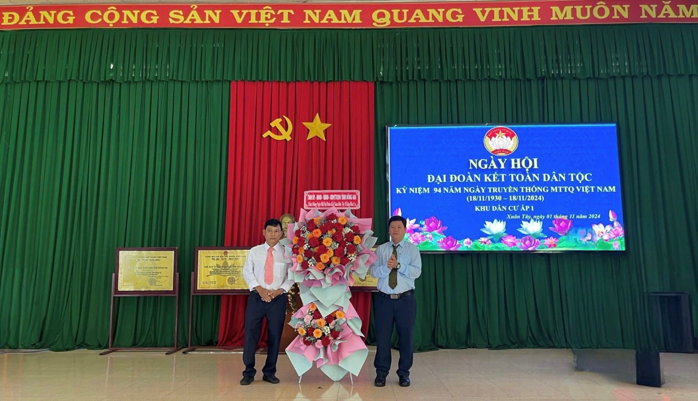 Phó Chủ tịch Ủy ban MTTQ Việt Nam tỉnh Đồng Nai trao tặng lãng hoa của Tỉnh ủy - HĐND - UBND - UBMTTQVN tỉnh Đồng Nai chúc mừng Ngày hội tại ấp 1, xã Xuân Tây