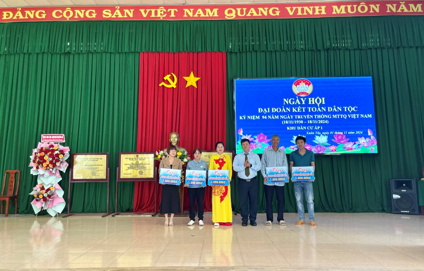 Nhân dịp Ngày hội, Ông Vũ Đình Trung, Phó Chủ tịch Ủy ban MTTQ Việt Nam tỉnh đã trao tặng quà của Lãnh đạo tỉnh cho Nhân dân ấp 1 (10 triệu đồng) và 05 phần quà (1,0 triệu đồng/phần) cho 05 cá nhân điển hình tiêu biểu có thành tích xuất sắc xây dựng ấp 1 trong năm 2024; UBND xã Xuân Tây đã tặng giấy khen cho 03 tập thể và Ban vận động ấp 1 tặng giấy khen cho 04 cá nhân có thành tích xuất sắc trong thực hiện Cuộc vận động “Toàn dân đoàn kết xây dựng nông thôn mới, đô thị văn minh”; dịp này, cũng trao tặng 06 phần học bổng cho các em học sinh nghèo hiếu học; 150 phần học bổng cho các em học sinh giỏi và 26 phần quà cho hộ nghèo, hộ khó khăn trên địa bàn ấp.