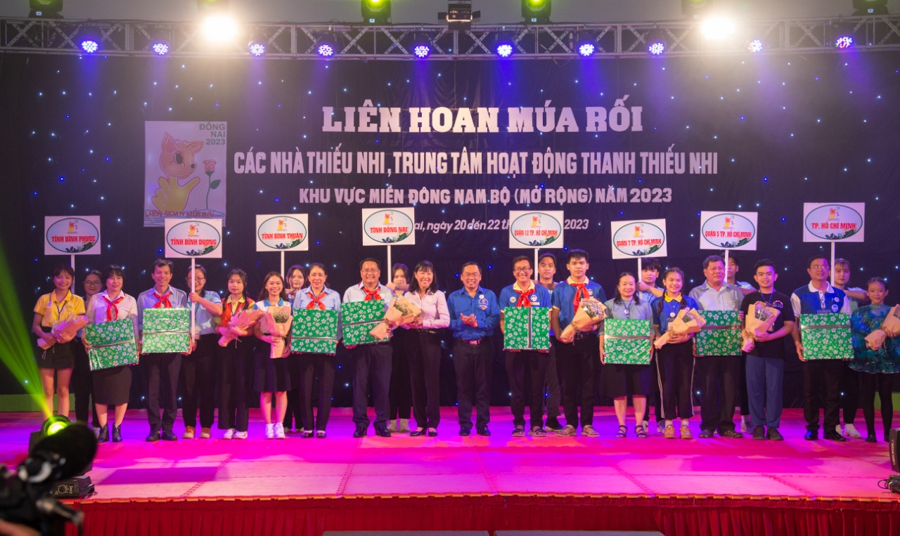 Các đồng chí lãnh đạo Ban Dân vận Tỉnh ủy, Đoàn TNCS Hồ Chí Minh tỉnh Đồng Nai tặng quà cho các đội tham gia Liên hoan