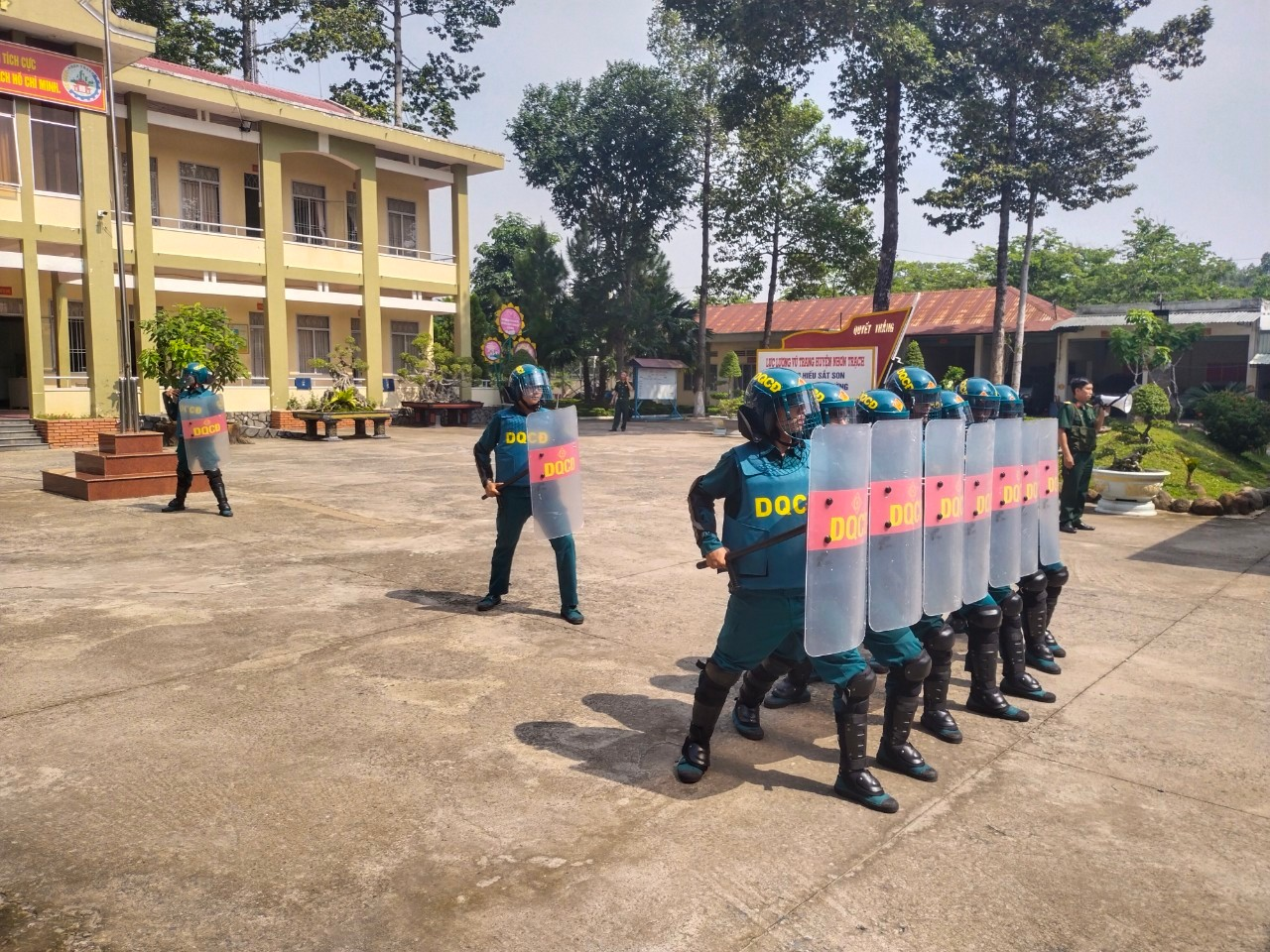 Huấn luyện đội hình lá chắn của dân quân thường trực bảo vệ trụ sở, cơ quan, đơn vị