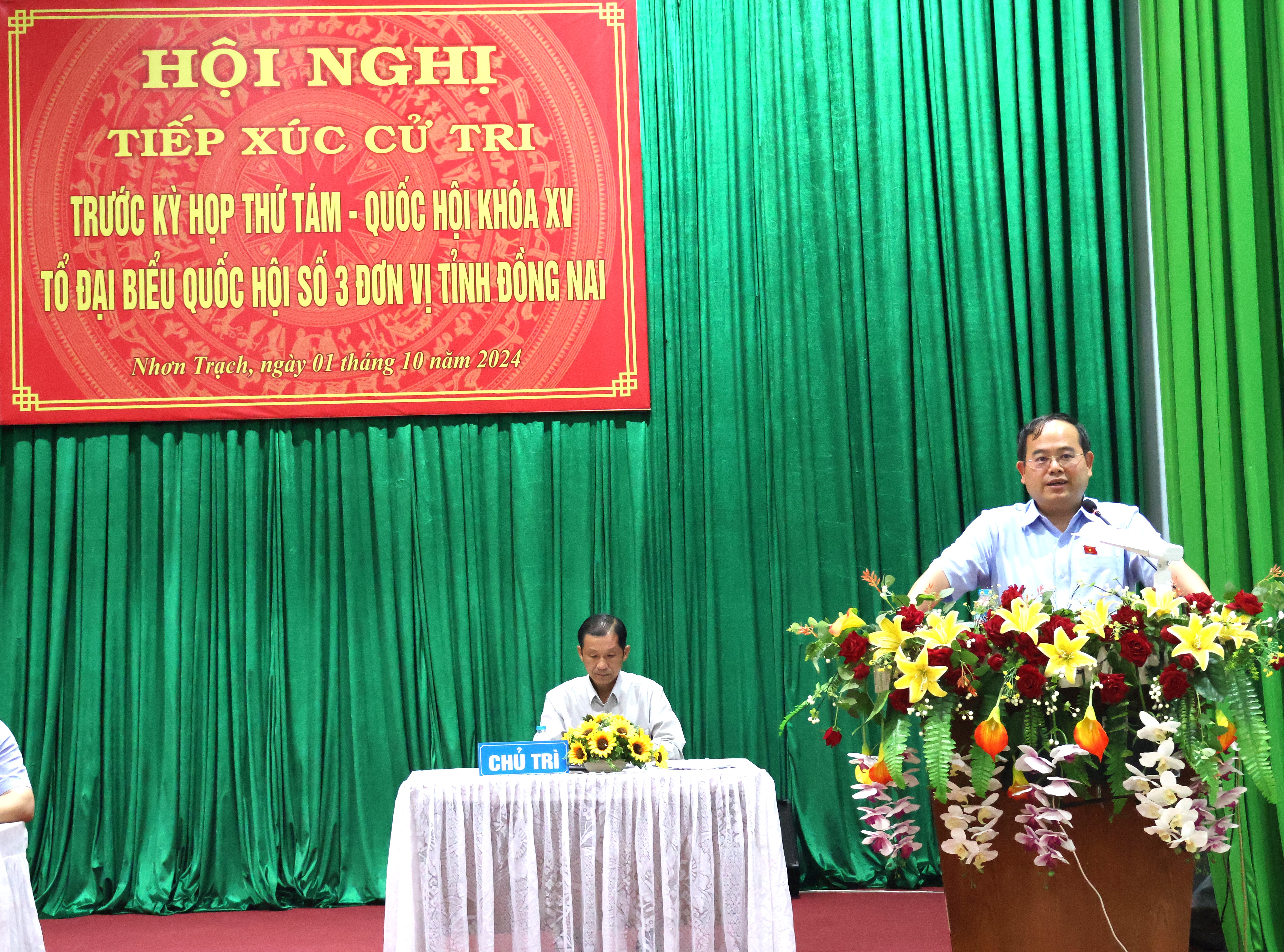 Ngày 01/10/2024, Tổ đại biểu Quốc hội (ĐBQH) tỉnh đơn vị số 3 gồm các đại biểu: Quản Minh Cường - Phó bí thư Tỉnh ủy, Trưởng đoàn ĐBQH tỉnh; đại biểu Nguyễn Công Long - Ủy viên Thường trực Ủy ban Tư pháp của Quốc hội và đại biểu Đỗ Huy Khánh- Phó giám đốc Sở Giáo dục và đào tạo đã có buổi tiếp xúc với cử tri huyện Nhơn Trạch trước kỳ họp thứ tám – Quốc hội Khóa XV.