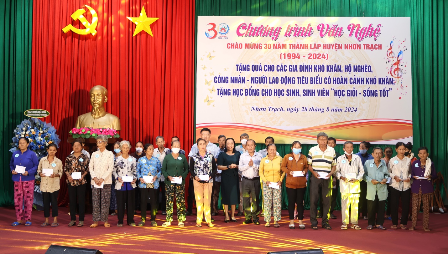 Đêm 28/8/2024, UBND huyện Nhơn Trạch đã tổ chức chương trình văn nghệ chào mừng 30 năm thành lập huyện và trao quà cho công nhân, học sinh có hoàn cảnh khó khăn và hộ nghèo trên địa bàn.