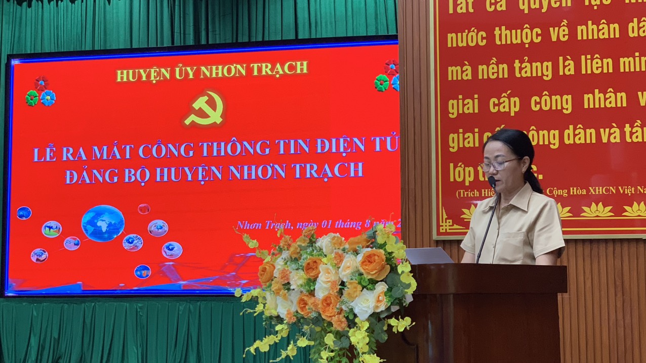 Phát biểu tại buổi lễ, Phó Bí thư thường trực Huyện ủy Dương Thị Mỹ Châu cho biết, Cổng thông tin điện tử Đảng bộ huyện Nhơn Trạch trên internet được thành lập theo Quyết định số 660-QĐ/HU ngày 26/02/2024 của Ban Thường vụ Huyện ủy. Đây là địa chỉ không gian mạng cung cấp thông tin chính thống về chủ trương, đường lối của Đảng bộ cho tổ chức đảng, đảng viên và người dân; góp phần nâng cao năng lực, sức chiến đấu của các tổ chức đảng, đảng viên trong công tác xây dựng Đảng; đồng thời, cho phép liên kết, tích hợp các kênh thông tin, dịch vụ và ứng dụng, qua đó, cán bộ, đảng viên và người dân có thể khai thác, sử dụng. Cổng thông tin của Đảng bộ huyện là kênh thông tin quan trọng: Giới thiệu, thông tin về huyện Nhơn Trạch, về hoạt động của Ban Chấp hành Đảng bộ huyện, Ban Thường vụ Huyện ủy, Thường trực Huyện ủy và các cấp ủy trực thuộc huyện; thông tin về chủ trương, đường lối, chính sách và pháp luật của Đảng, Nhà nước.