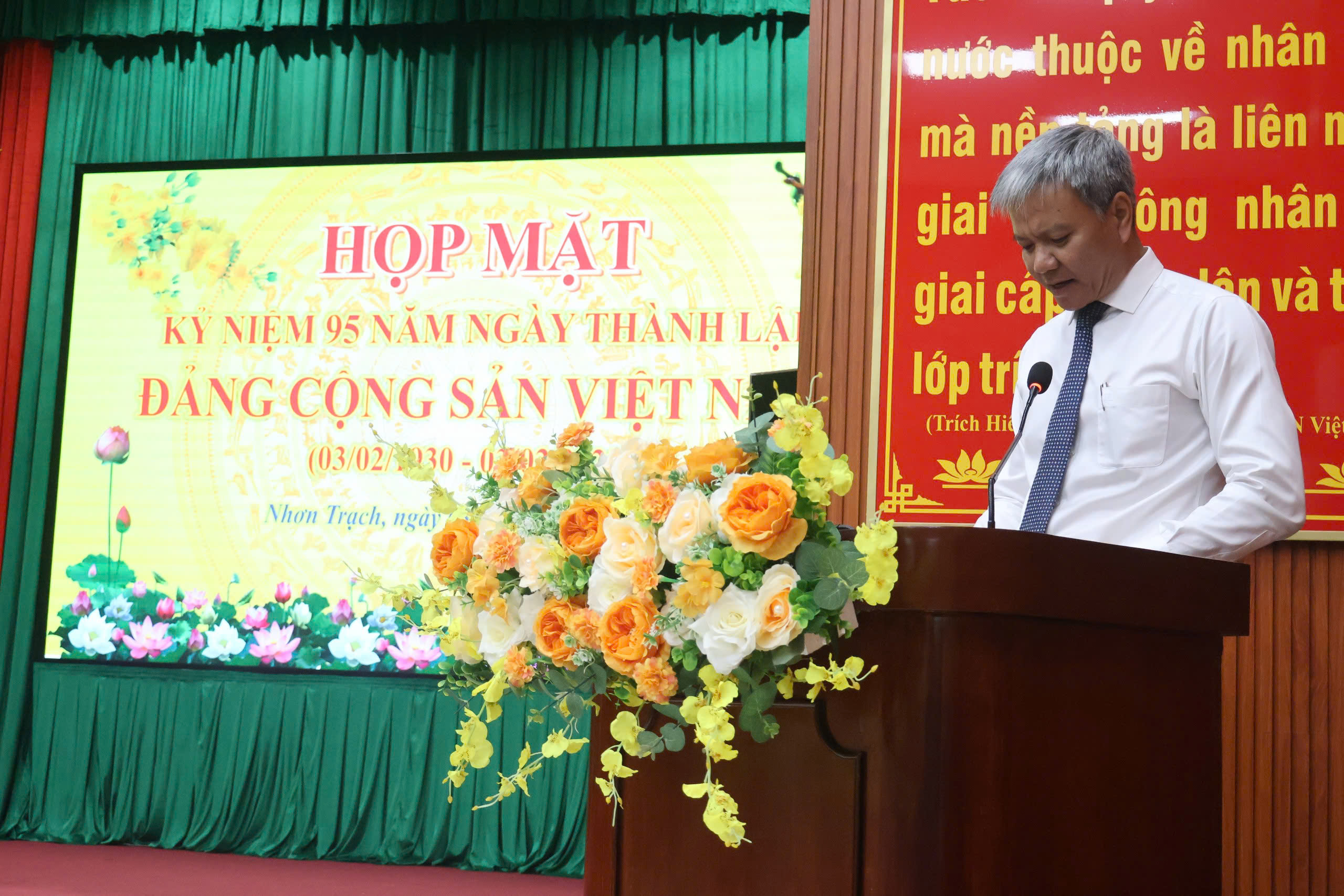 Tại buổi họp mặt, đồng chí Từ Nam Thành – Tỉnh ủy viên, Bí thư Huyện ủy đã ôn lại truyền thống đấu tranh cách mạng vẻ vang của Đảng và nhân dân Việt Nam trong sự nghiệp xây dựng và bảo vệ Tổ quốc. 95 năm qua đã khẳng định bản lĩnh, trí tuệ, uy tín, năng lực lãnh đạo và sức chiến đấu của Đảng; khẳng định niềm tin của nhân dân đối với Đảng. Đồng thời nhấn mạnh, các tầng lớp nhân dân huyện Nhơn Trạch luôn một lòng đi theo Đảng, kề vai, sát cánh, chung sức, đồng lòng trong suốt quá trình đấu tranh giành độc lập dân tộc, xây dựng và bảo vệ Tổ quốc Việt Nam Xã hội Chủ nghĩa. Đặc biệt, sau 30 năm thành lập, huyện Nhơn Trạch đã thay đổi diện mạo từng ngày, trở thành địa phương có tốc độ phát triển các khu công nghiệp thuộc top đầu của tỉnh; tổng thu ngân sách trên địa bàn thuộc nhóm cấp huyện cao nhất nước; tỷ lệ thu ngân sách hằng năm tăng khoảng 20%. Riêng năm 2024, thu ngân sách Nhà nước của huyện đạt trên 146% chỉ tiêu được giao. Cơ sở hạ tầng được đầu tư xây dựng đồng bộ, theo hướng kết nối vùng và phát triển đô thị. Thu nhập bình quân đâu người tăng hơn 50 lần so với năm 1995. Các hoạt động văn hóa, thể thao được quan tâm đầu tư phát triển. Đời sống người dân ngày càng được cải thiện cả về vật chất và tinh thần. Công tác xây dựng Đảng, xây dựng hệ thống chính trị được chú trọng và lãnh đạo thực hiện đồng bộ, toàn diện trên các lĩnh vực công tác. Quốc phòng, an ninh được tăng cường, góp phần ổn định chính trị - xã hội. Xác định năm 2025 có ý nghĩa đặc biệt quan trọng, là năm tăng tốc, bứt phá để về đích, thực hiện thắng lợi Kế hoạch phát triển kinh tế - xã hội cả nhiệm kỳ 2020 - 2025 và là năm diễn ra nhiều sự kiện trọng đại của đất nước, Bí thư Huyện uỷ cũng đề nghị toàn hệ thống chính trị cần có quyết tâm cao, hết lòng hết sức phục vụ Nhân dân, giữ vững những thành quả đạt được, tiếp tục ra sức xây dựng, phát triển huyện nhà giàu mạnh, sớm trở thành đô thị mới, đô thị xanh, văn minh, hiện đại theo Nghị quyết số 09 – NQ/Tu của Ban Thường vụ Tỉnh ủy về “phát triển đô thị Nhơn Trạch đến năm 2030, tầm nhìn đến năm 2040”.
