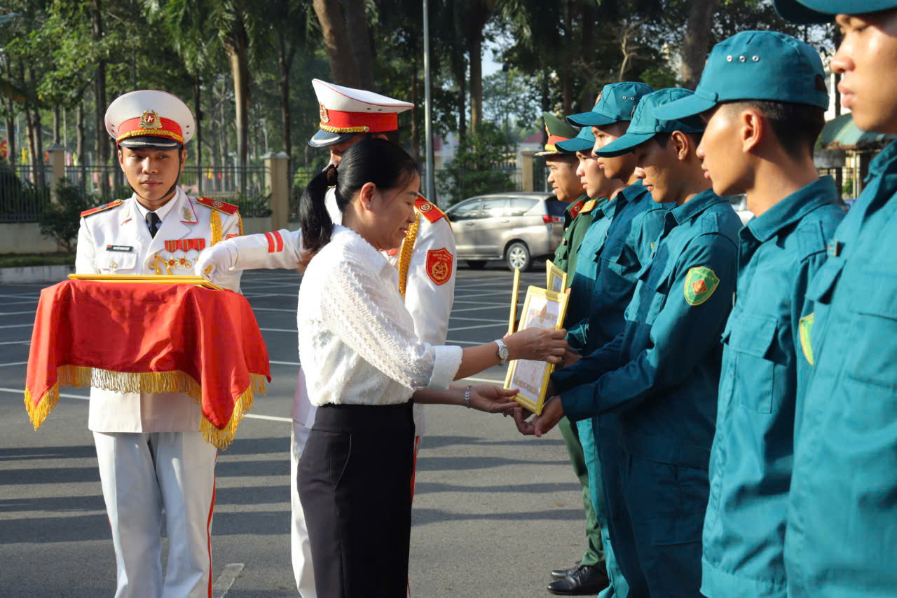 Đồng chí Dương Thị Mỹ Châu, Phó Bí thư Thường trực Huyện ủy, Chủ tịch HĐND huyện trao thưởng cho cán bộ, chiến sĩ.