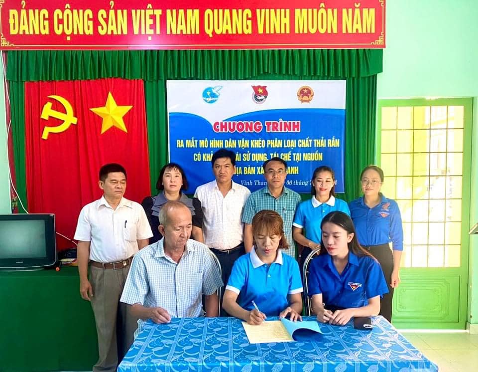 Lễ ký kết giữa các Chi đoàn, Chi hội và Ban ấp thực hiện mô hình Dân vận khéo, phân loại chất rắn có khả năng tái chế, tái sử dụng tại nguồn xã Vĩnh Thanh