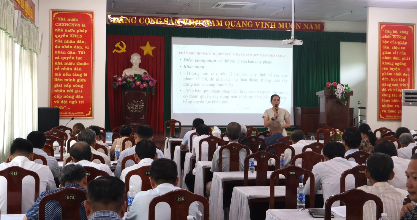 Tại buổi tập huấn, các đại biểu đã được nghe Thạc sỹ Trần Anh Thơ – Trưởng phòng Quản lý Văn hoá và Gia đình, Sở Văn hoá Thể thao và Du lịch triển khai Chuyên đề 1 – Phổ biến văn bản quy phạm pháp luật quản lý nhà nước về xây dựng đời sống văn hoá cơ sở, nâng cao chất lượng các danh hiệu văn hoá và phong trào “TDĐKXDĐSVH”, trong đó có Nghị định số 86/2023/NĐ-CP, ngày 7/12/2023 của Chính phủ quy định về khung tiêu chuẩn và trình tự, thủ tục, hồ sơ xét tặng danh hiệu “Gia đình văn hoá”, “Thôn, tổ dân phố văn hoá”, “Xã, phường, thị trấn tiêu biểu” và Nghị định số 61/2023/NĐ-CP, ngày 16/8/2023 của Chính phủ về xây dựng và thực hiện hương ước, quy ước của cộng đồng dân cư; đồng thời triển khai các Kế hoạch của UBND tỉnh và Hướng dẫn của Sở Văn hoá, Thể thao và Du lịch; Hướng dẫn của BCĐ Phong trào “TDĐKXDĐSVH” trong thực hiện Nghị định 86 và Nghị định 61 của Chính phủ.