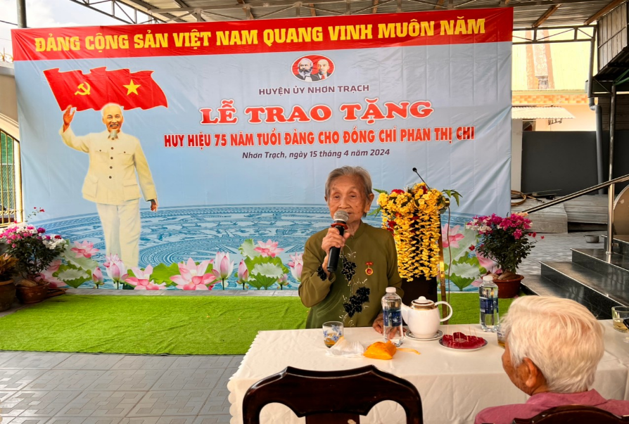 Tại buổi lễ đồng chí Lê Thành Mỹ - TUV, Bí thư Huyện ủy Nhơn Trạch chúc mừng đồng chí Phan Thị Chi nhận Huy hiệu 75 năm tuổi Đảng, đồng thời bày tỏ lòng tri ân, trân trọng những cống hiến của đồng chí đối với sự phát triển của Đảng bộ và chính quyền huyện Nhơn Trạch nói chung và xã Long Thọ nói riêng và mong muốn đồng chí giữ gìn sức khảo, tiếp tục là tấm gương sáng để các thế hệ đảng viên trẻ học tập, noi theo.