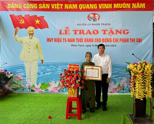 Vừa qua, Ban Thường vụ Huyện ủy Nhơn Trạch đã tổ chức Lễ trao tặng Huy hiệu Đảng 75 năm cho đồng chí Phan Thị Chi - Đảng viên đang sinh hoạt tại Chi bộ ấp 2 trực thuộc Đảng ủy xã Long Thọ, huyện Nhơn Trạch.