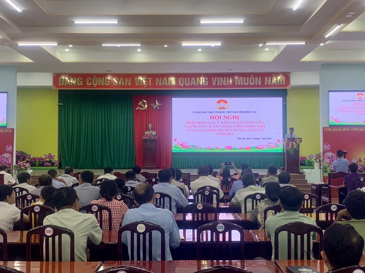 Chiều ngày 11/7/2024, Ủy ban MTTQ Việt Nam tỉnh Đồng Nai phối hợp với Ủy ban MTTQ Việt Nam huyện Cẩm Mỹ tổ chức hội nghị triển khai lấy ý kiến hài lòng của người dân về kết quả xây dựng huyện NTM nâng cao năm 2024. Dự hội nghị có ông Vũ Đình Trung, Phó Chủ tịch Ủy ban MTTQ Việt Nam tỉnh; Trần Văn Thức, UVTVHU, Chủ tịch Ủy ban MTTQ Việt Nam huyện Cẩm Mỹ; đại diện lãnh đạo các sở, ban, ngành cấp huyện và các xã, thị trấn trên địa bàn huyện.