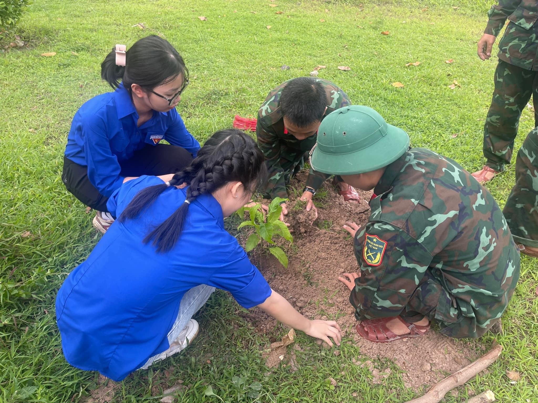 Đoàn viên thanh niên và chiến sĩ Trường Sĩ quan lục quân 2 trồng cây xanh sau buổi ra quân tại trường