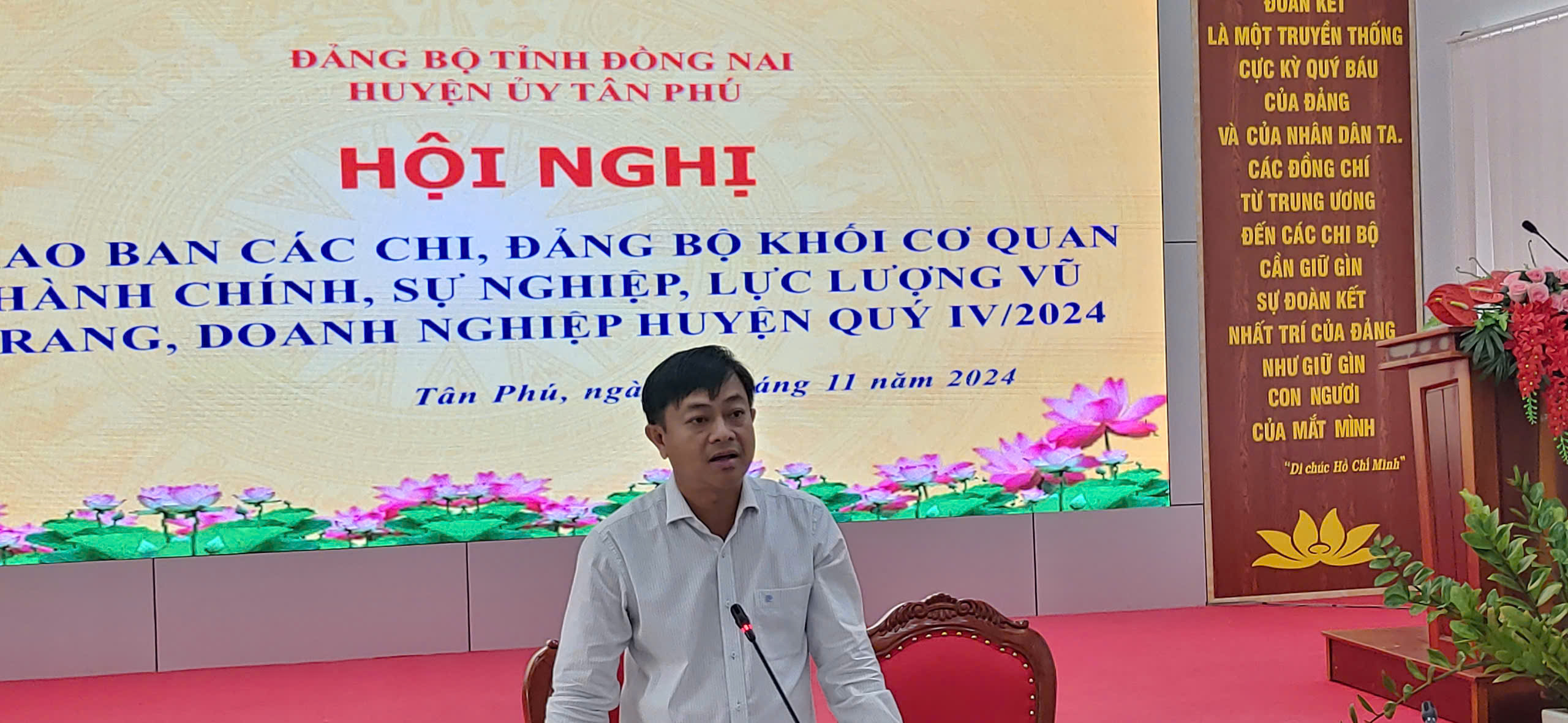 Sáng ngày 28/11/2024, Huyện ủy Tân Phú tổ chức hội nghị giao ban các chi, đảng bộ khối cơ quan hành chính – sự nghiệp, lực lượng vũ trang, doanh nghiệp quý IV/2024. Đồng chí Trịnh Văn Luận – Phó bí thư Thường trực Huyện ủy, Chủ tịch HĐND huyện chủ trì hội nghị. Tham dự hội nghị còn có các đồng chí đại diện lãnh đạo UBND huyện, UB.MTTQ Việt Nam huyện, các ban Đảng, Văn phòng Huyện ủy, Trung tâm Chính trị huyện.