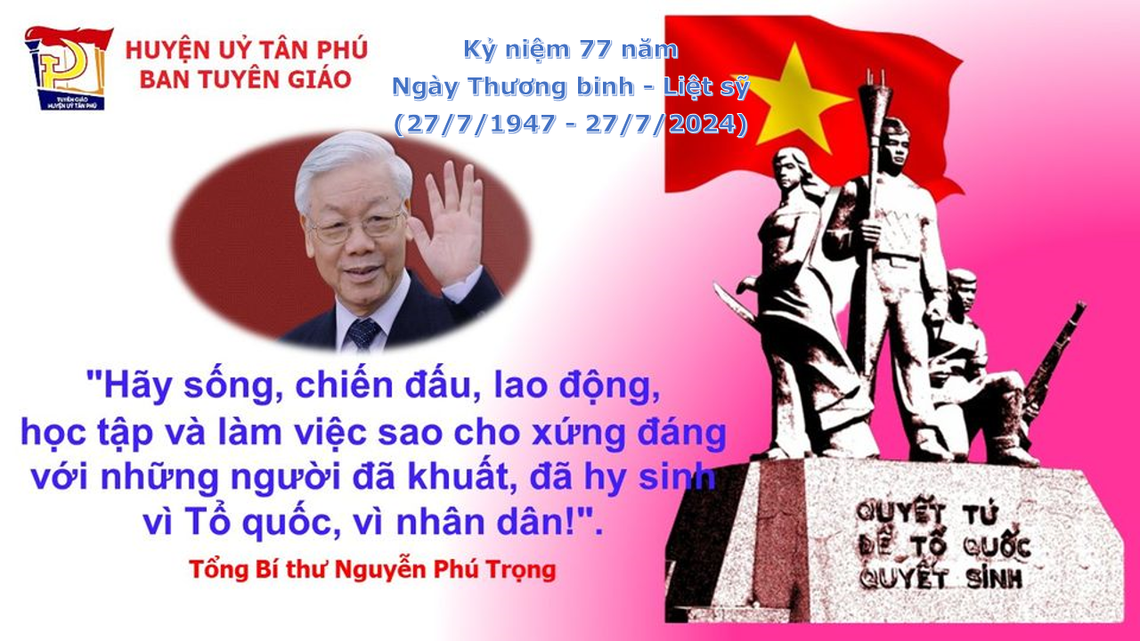 Ngày Thương binh - Liệt sỹ 27/7 hằng năm là ngày lễ kỷ niệm quan trọng, có ý nghĩa nhân văn sâu sắc, đây là dịp để toàn Đảng, toàn dân và toàn quân ta tưởng nhớ, tri ân các bậc cách mạng tiền bối, anh hùng liệt sỹ, những người con ưu tú của dân tộc, cũng như những người con yêu dấu của quê hương Tân Phú đã anh dũng hy sinh vì sự nghiệp đấu tranh giải phóng dân tộc, xây dựng và bảo vệ Tổ quốc, để quê hương Tân Phú, đất nước Việt Nam trường tồn, ấm no hạnh phúc.